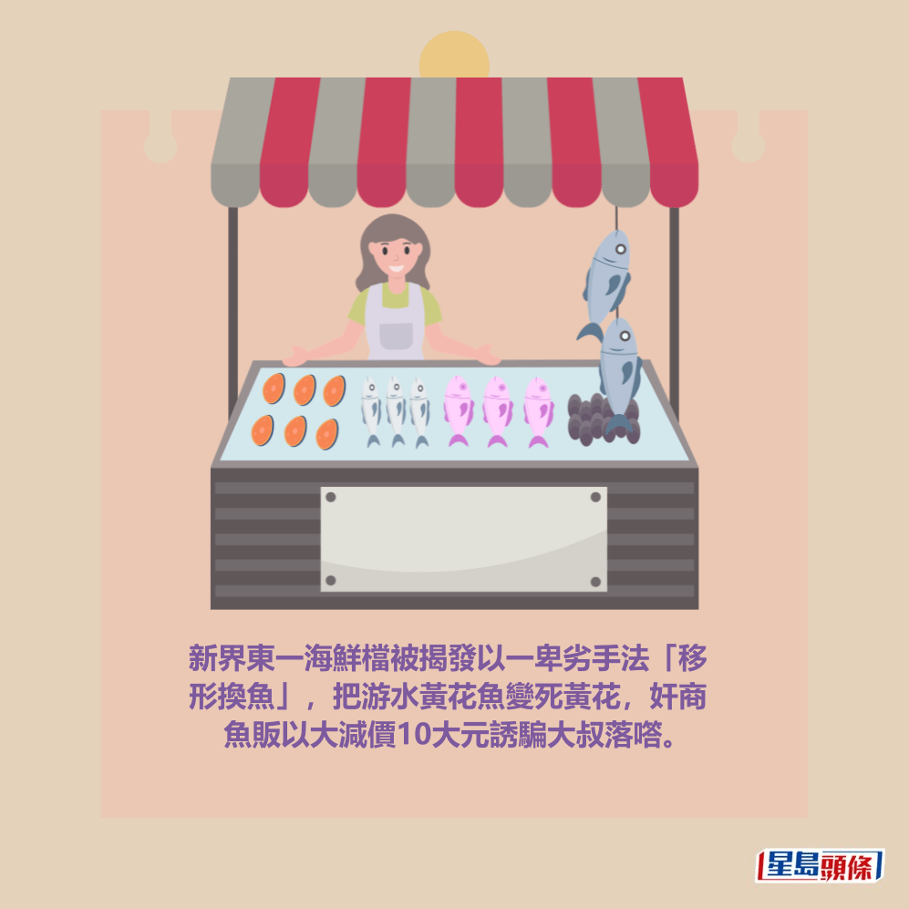 新界東一海鮮檔被揭發以卑劣手法「移形換魚」,把游水黃花魚變死黃花,奸商魚販以大減價10大元誘騙大叔顧客落㗳。詳情見下圖及下文:
