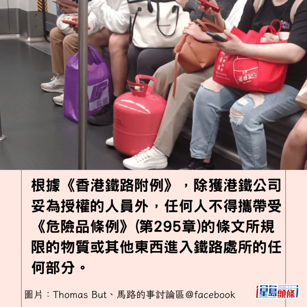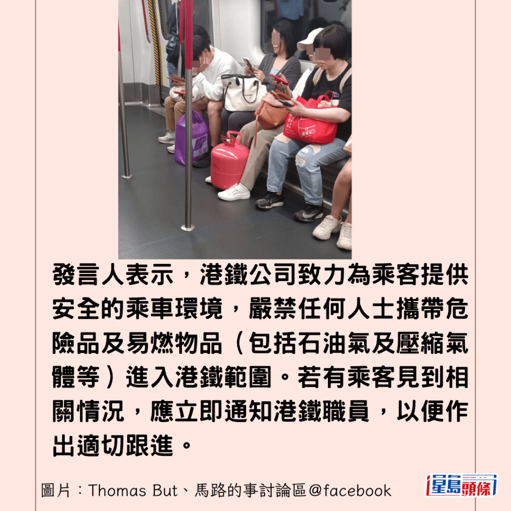 港鐵發言人回覆《星島頭條》查詢表示,嚴禁任何人士攜帶危險品及易燃物品(包括石油氣及壓縮氣體等)進入港鐵範圍。若有乘客見到相關情況,應立即通知港鐵職員,以便作出適切跟進。