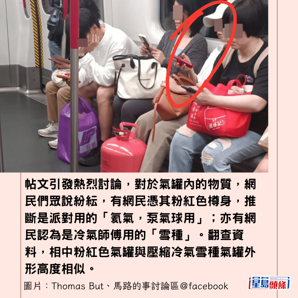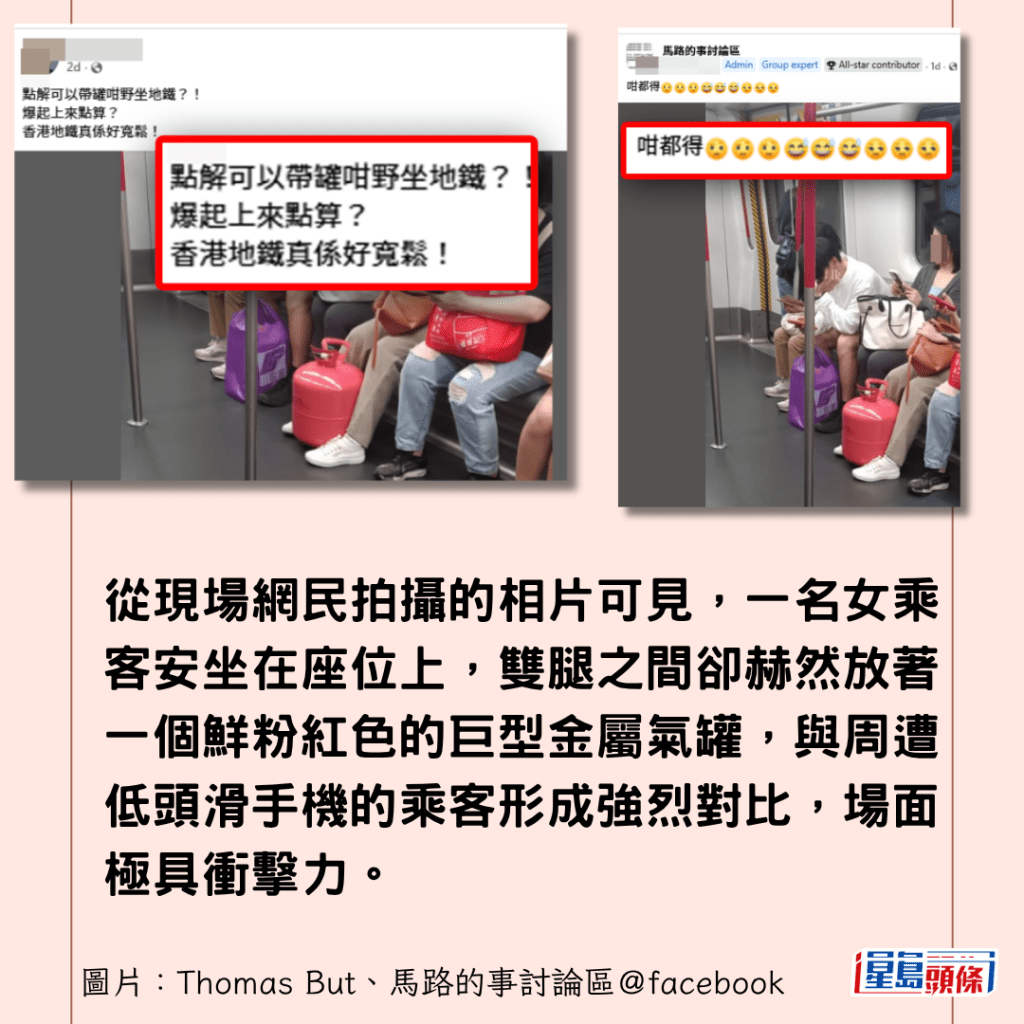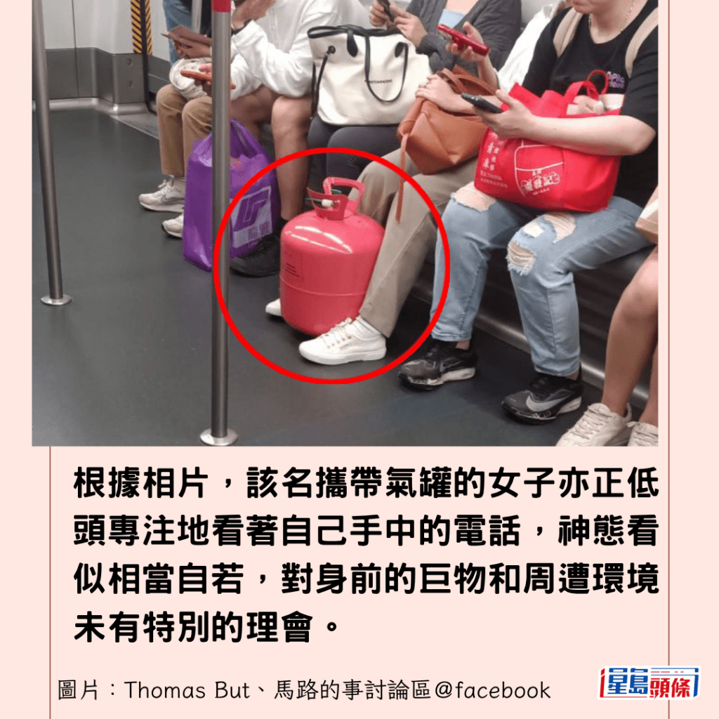 從現場網民拍攝的相片可見,一名戴白色鴨舌帽的女乘客安坐在座位上,雙腿之間的地上卻赫然放著一個鮮粉紅色的巨型金屬氣罐,與周遭低頭滑手機的乘客形成強烈對比,場面極具衝擊力。