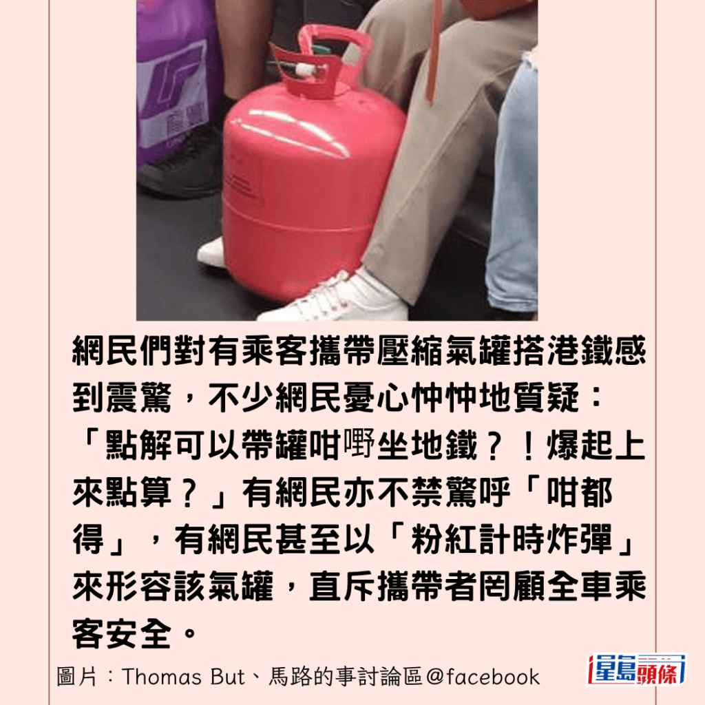 網民們對有乘客攜帶壓縮氣罐搭港鐵感到震驚,不少網民憂心忡忡地質疑:「點解可以帶罐咁嘢坐地鐵?!爆起上來點算?」有網民亦不禁驚呼「咁都得」,有網民甚至以「粉紅計時炸彈」來形容該氣罐,直斥攜帶者罔顧全車乘客安全。