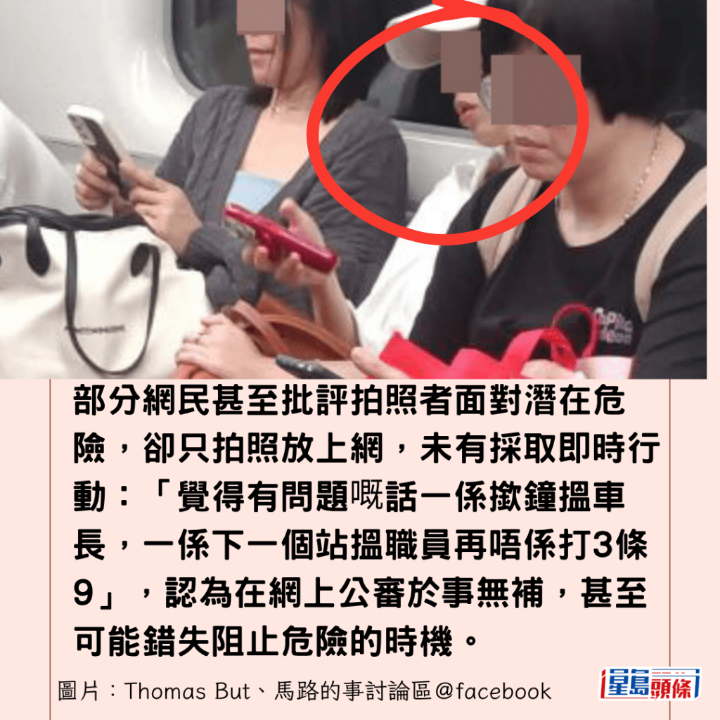 面對潛在危險,網民們對於現場乘客仍「漠視」「專心睇手機」感到不可思議:「想點?想一鑊熟?」「冇事咪返屋企,有事成車返地府」,部分網民甚至批評拍照者面對潛在危險,卻只拍照放上網,未有採取即時行動:「覺得有問題嘅話一係撳鐘搵車長,一係下一個站搵職員再唔係打3條9」,認為在網上公審於事無補,甚至可能錯失阻止危險的時機。