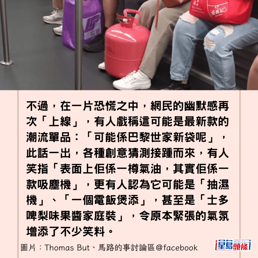 不過,在一片恐慌之中,網民的幽默感再次「上線」,有網民戲稱這可能是最新款的潮流單品:「可能係巴黎世家新袋呢」,此話一出,各種創意猜測接踵而來,有網民笑指「表面上佢係一樽氣油,其實佢係一款吸塵機」,有網民更開玩笑地認為它可能是「抽濕機」、「一個電飯煲添」,甚至是「士多啤梨味果醬家庭裝」,令原本緊張的氣氛增添了不少笑料。