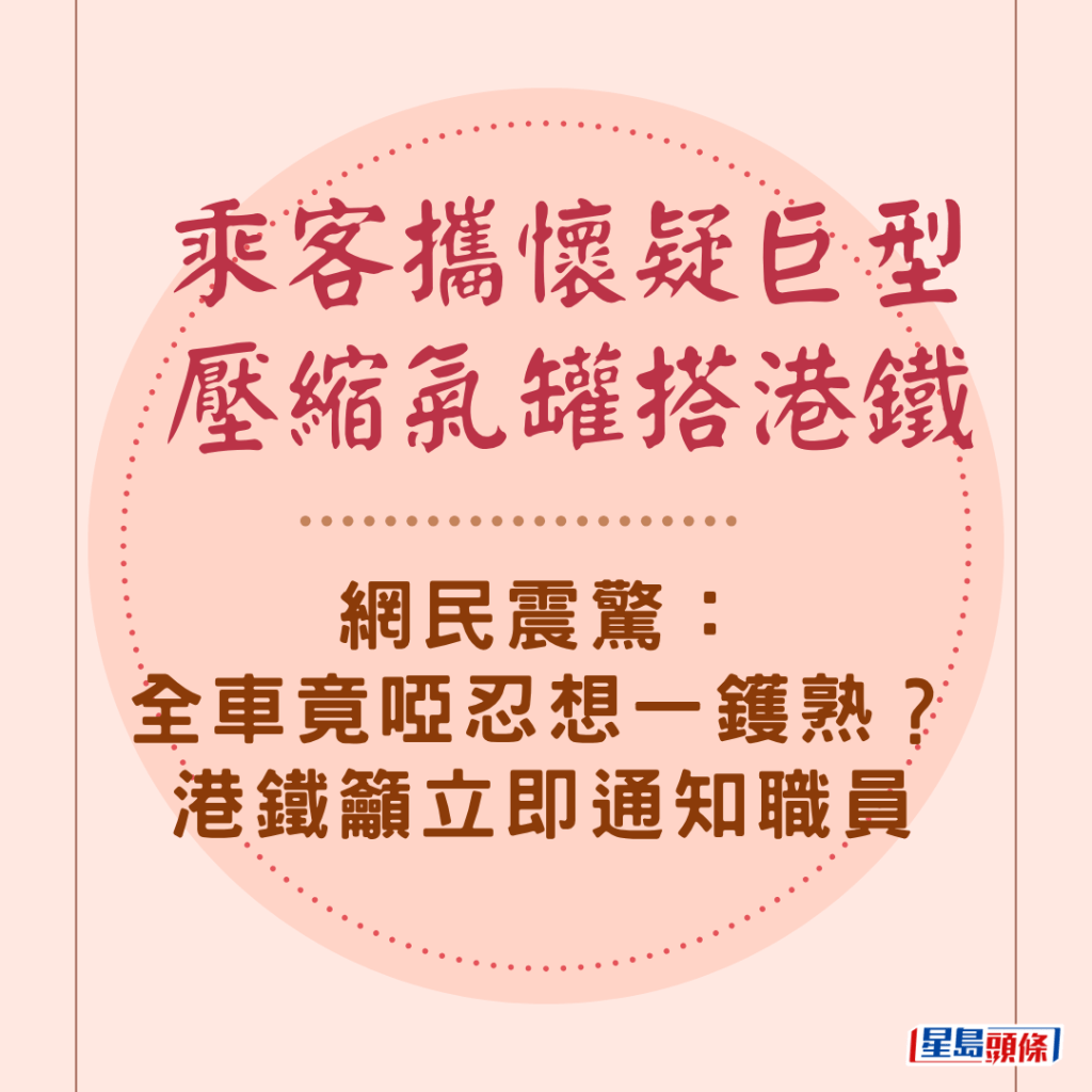 乘客攜懷疑巨型壓縮氣罐搭港鐵 網民震驚:全車竟啞忍想一鑊熟?港鐵籲立即通知職員↓↓↓↓