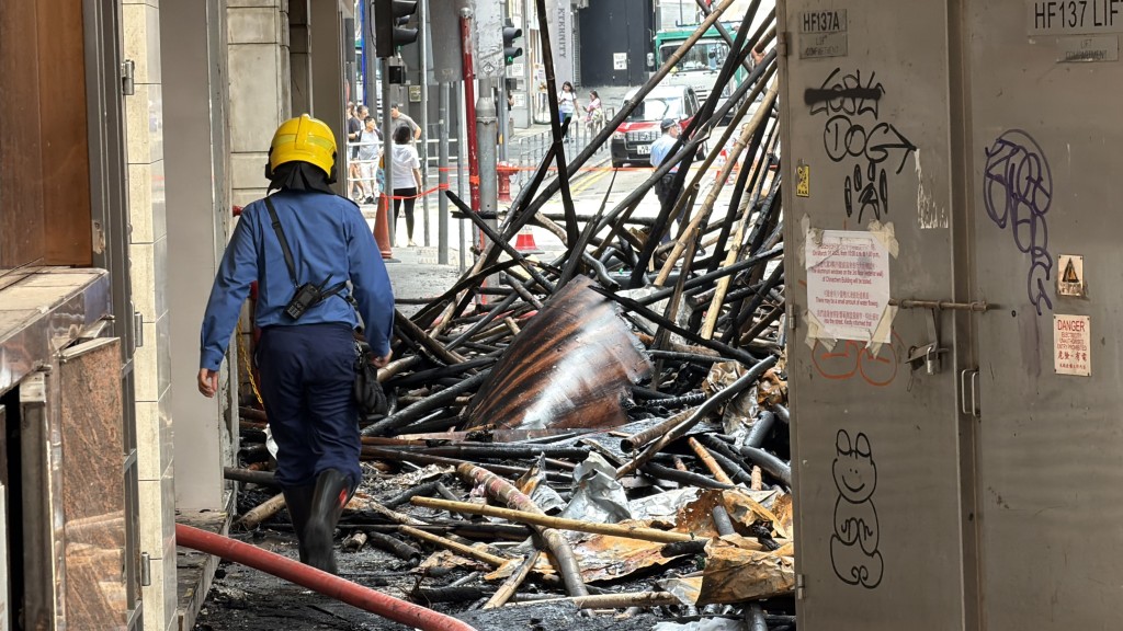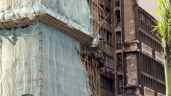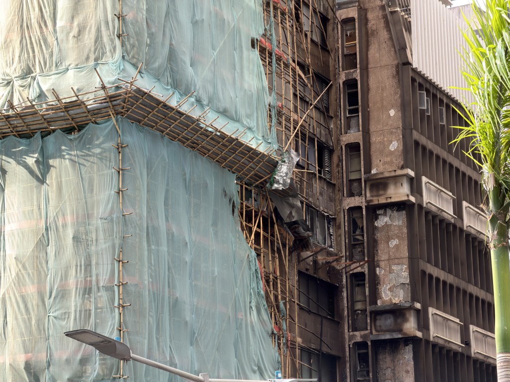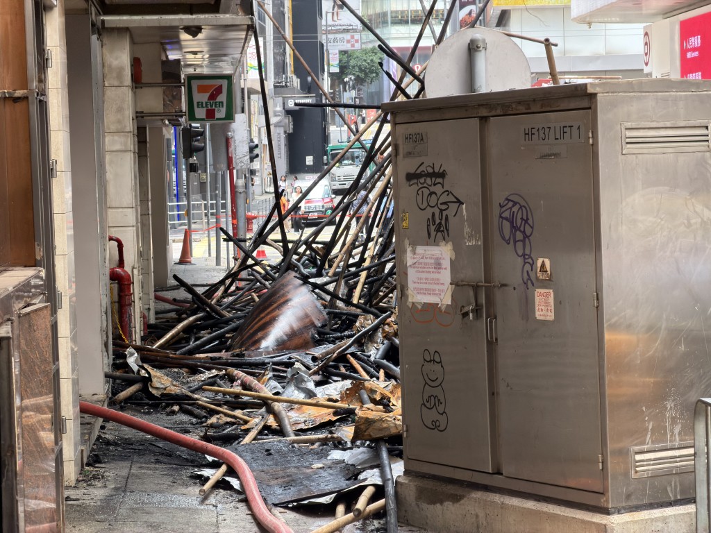 大火過後,現場至今未解封,華懋大廈對開的一段砵典乍街於今早仍然圍上封鎖線,消防員在場蒐證。所見大廈部分外牆和棚架被燒至焦黑,部分被焚毀的竹枝散落一地。