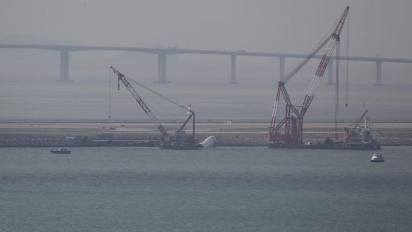 打撈團隊已於昨日(24日)晚上10時41分吊起失事貨機機尾,並放在躉船,等候移交民航意外調查機構處理。蔡楚輝攝