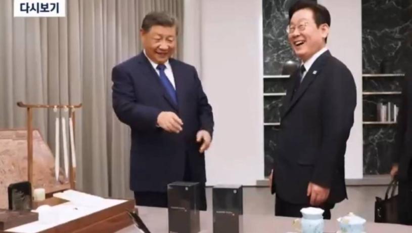 據韓國媒體報道,習近平與李在明會面前,雙方互贈禮物,習近平向李在明夫婦,送出2部小米曲屏手機及文房四寶。