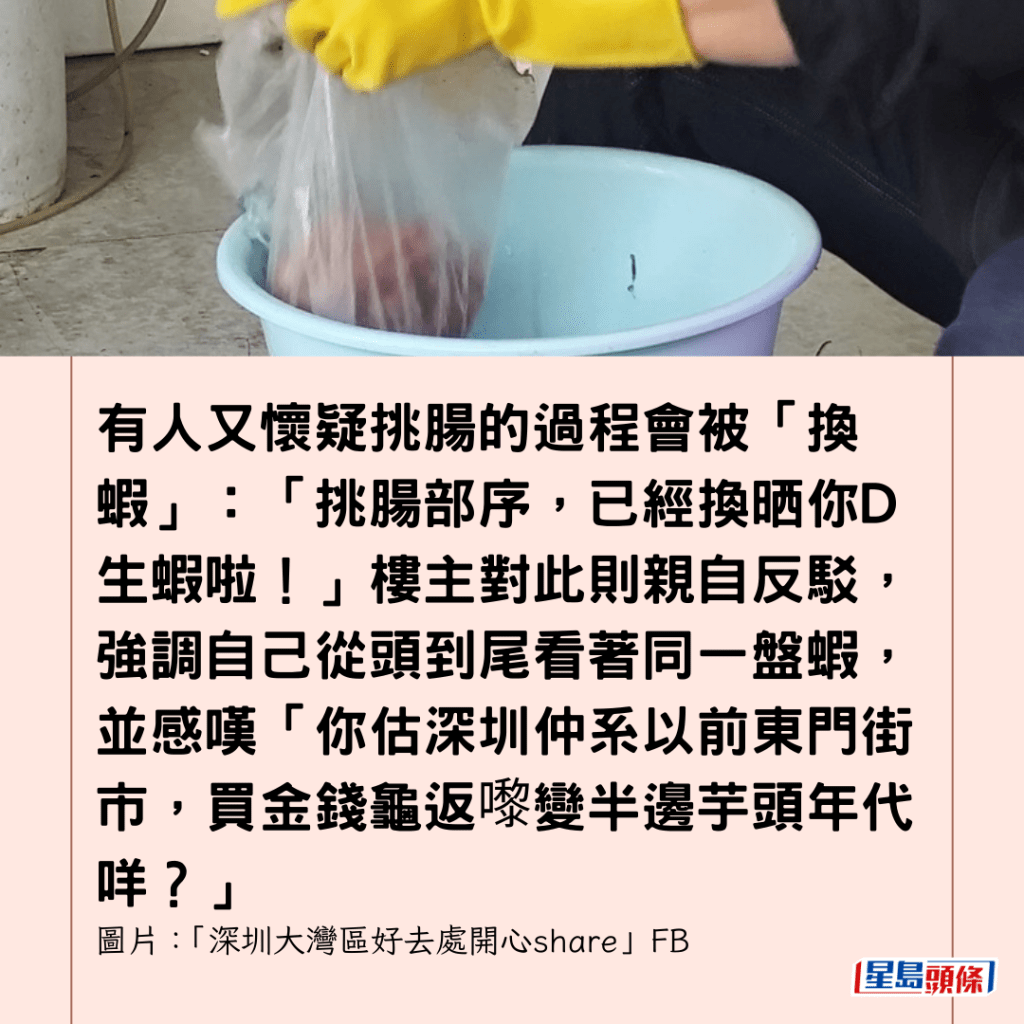 有人又懷疑挑腸的過程會被「換蝦」:「挑腸部序,已經換晒你D生蝦啦!」樓主對此則親自反駁,強調自己從頭到尾看著同一盤蝦,並感嘆「你估深圳仲系以前東門街市,買金錢龜返嚟變半邊芋頭年代咩?」