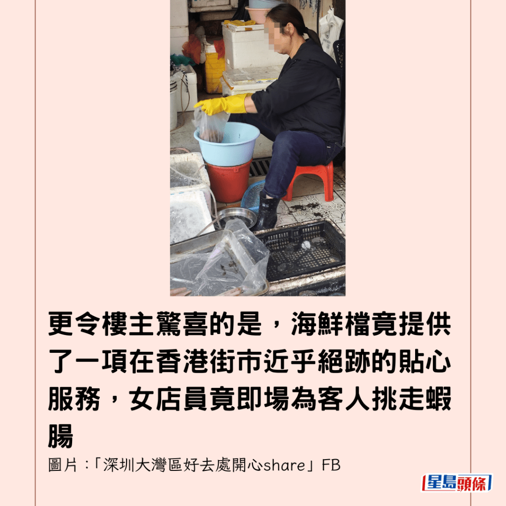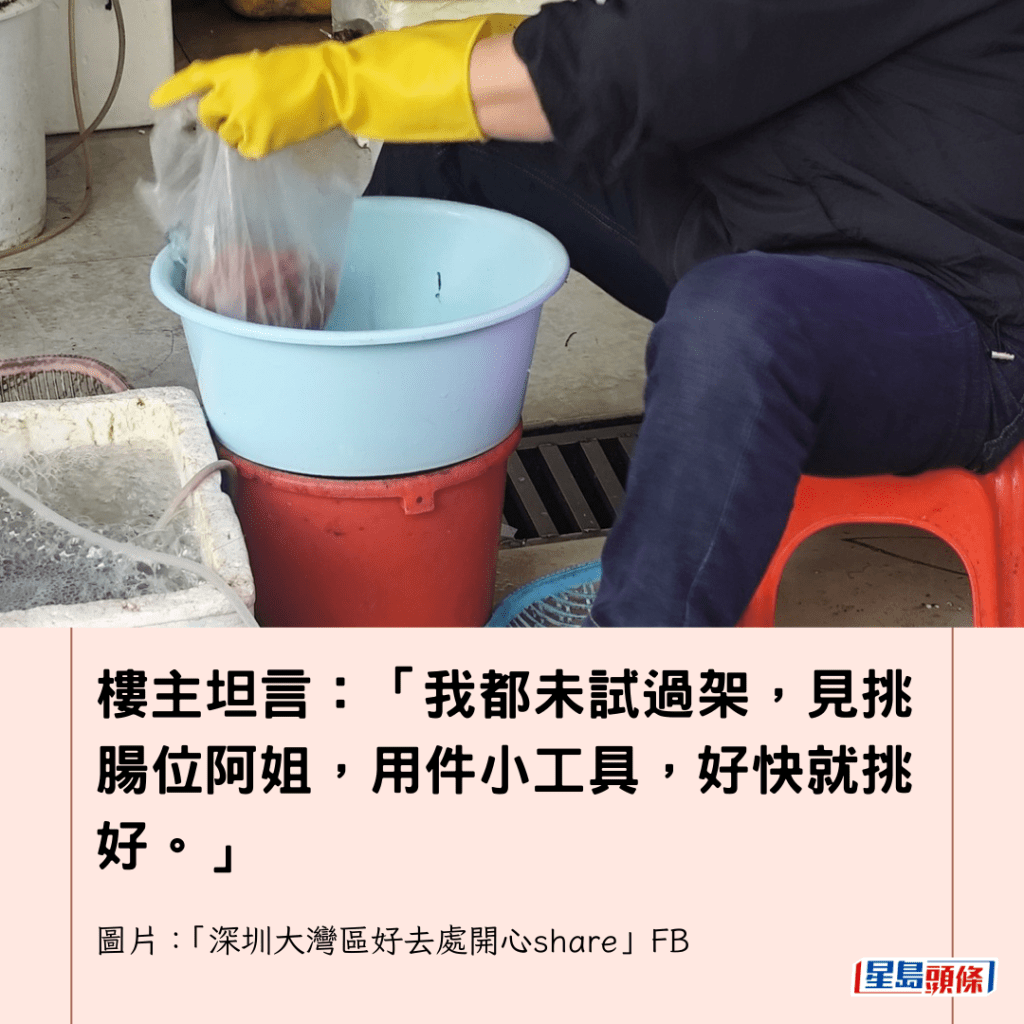更令樓主驚喜的是,海鮮檔竟提供了一項在香港街市近乎絕跡的貼心服務,女店員竟即場為客人挑走蝦腸,樓主坦言:「我都未試過架,見挑腸位阿姐,用件小工具,好快就挑好。」