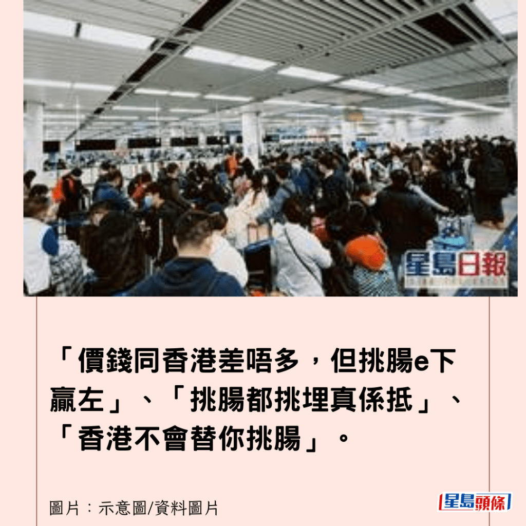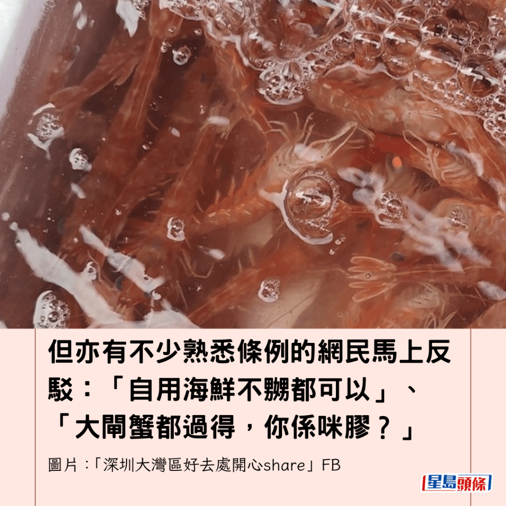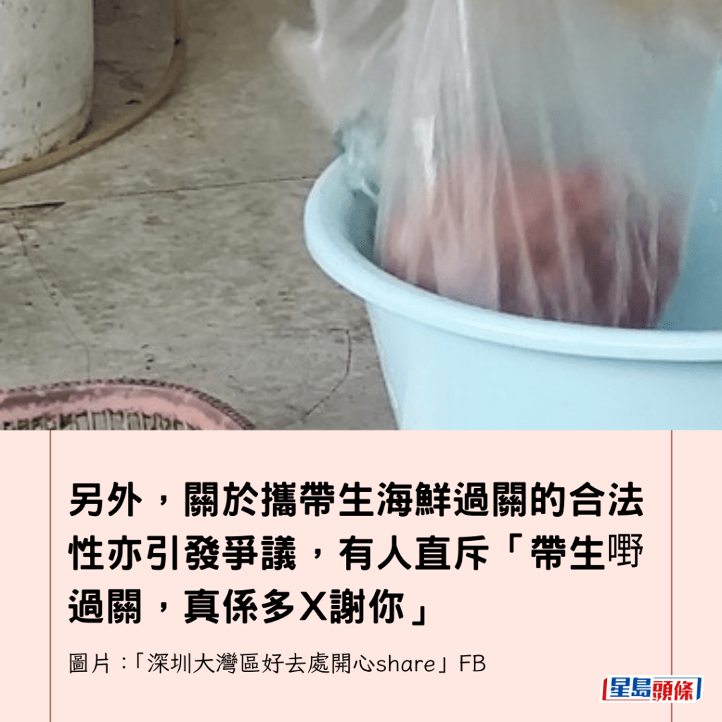另外,關於攜帶生海鮮過關的合法性亦引發爭議,有人直斥「帶生嘢過關,真係多X謝你」,但亦有不少熟悉條例的網民馬上反駁:「自用海鮮不嬲都可以」、「大閘蟹都過得,你係咪膠?」根據香港海關官方網頁資料,旅客在其私人行李中攜帶合理數量的海產以供自用,一般不受限制。