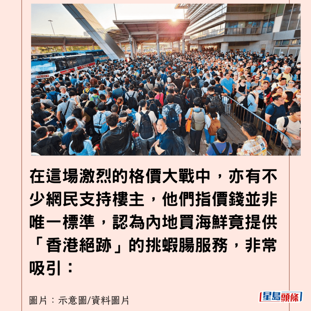 在這場激烈的格價大戰中,亦有不少網民支持樓主,他們指價錢並非唯一標準,認為內地買海鮮竟提供「香港絕跡」的挑蝦腸服務,非常吸引:「價錢同香港差唔多,但挑腸e下贏左」、「挑腸都挑埋真係抵」、「香港不會替你挑腸」。有網民又表示北上買餸可順便遊覽觀光,「去兜風散心,呢個係無價既」。