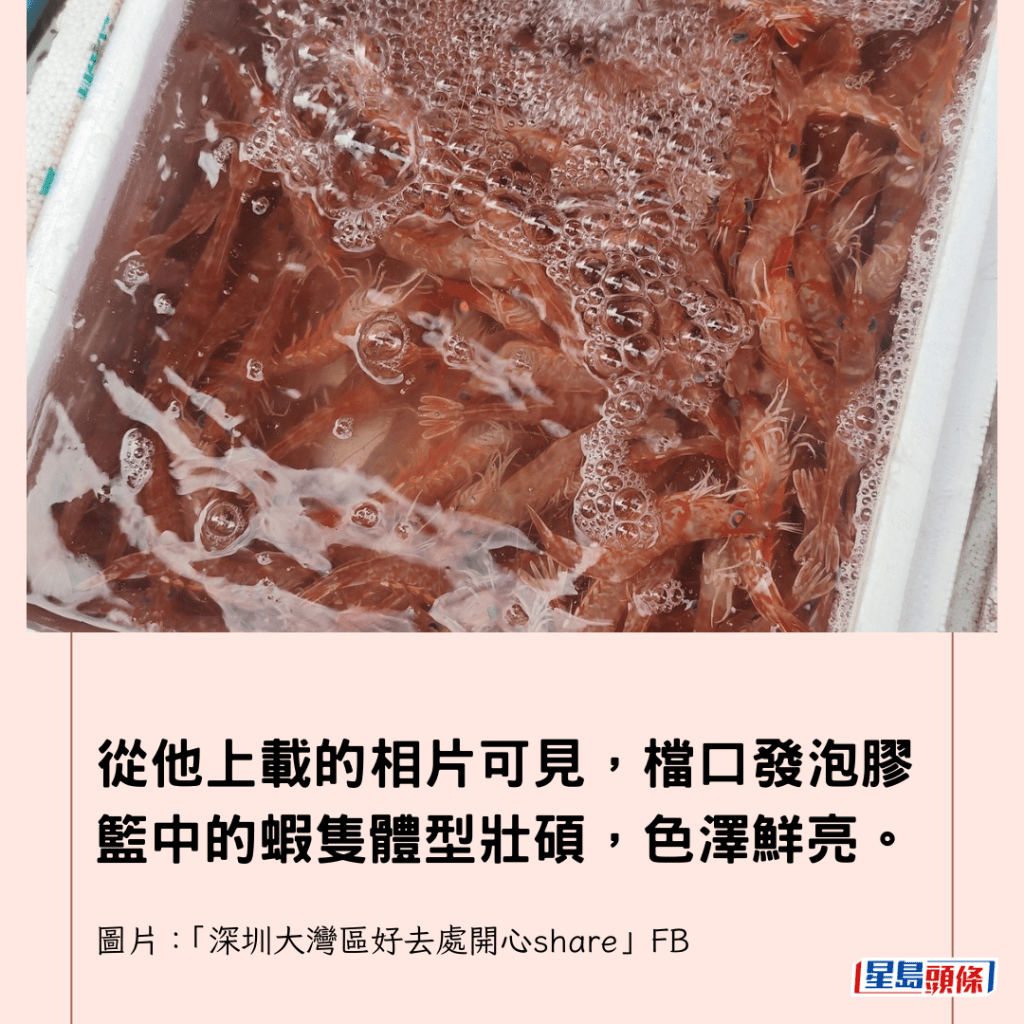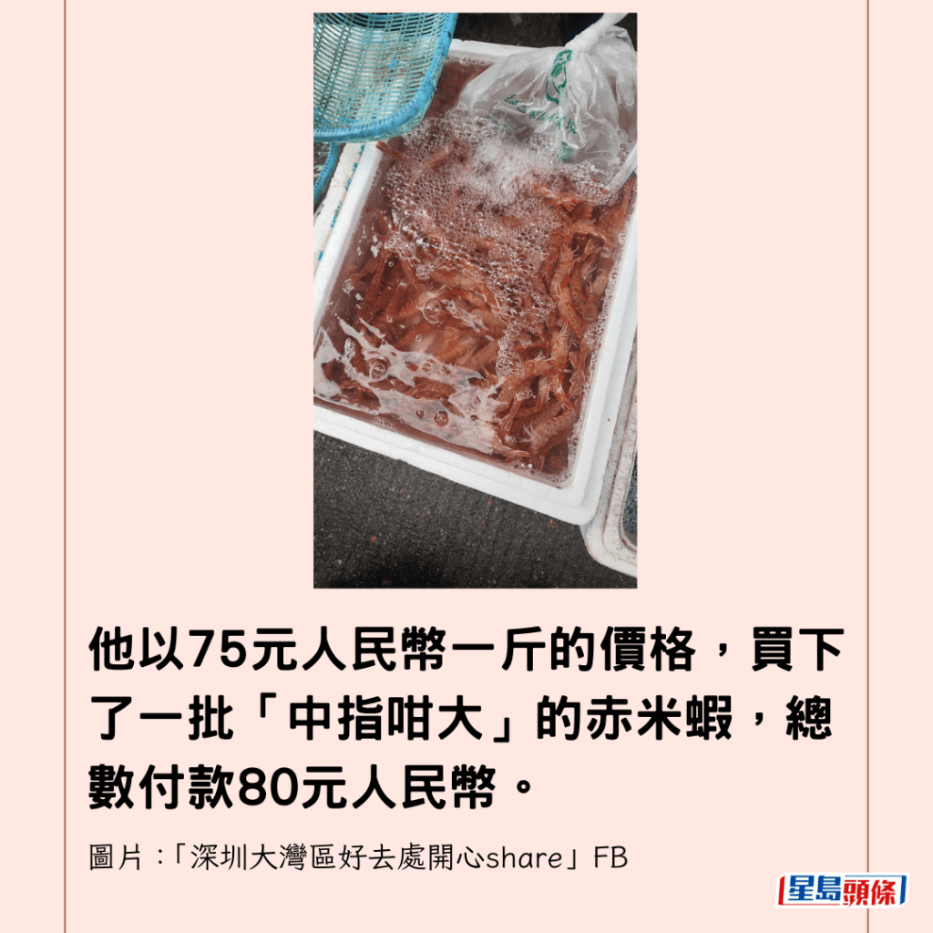 他以75元人民幣一斤的價格,買下了一批「中指咁大」的赤米蝦,總數付款80元人民幣。從他上載的相片可見,檔口發泡膠籃中的蝦隻體型壯碩,色澤鮮亮。