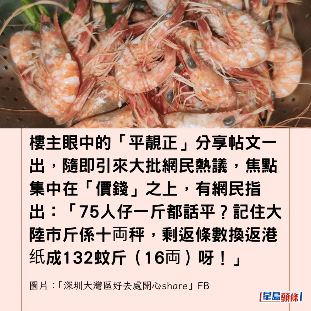 樓主眼中的「平靚正」分享帖文一出,隨即引來大批網民熱議,焦點集中在「價錢」之上,有網民指出:「75人仔一斤都話平?記住大陸市斤係十両秤,剩返條數換返港纸成132蚊斤(16両)呀!」