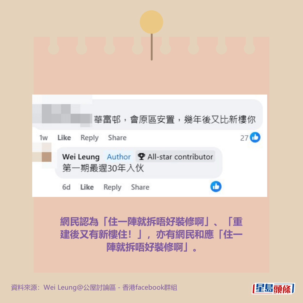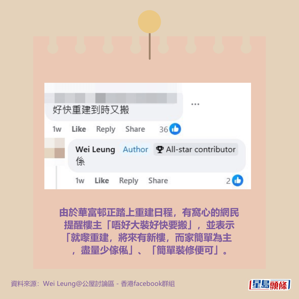 由於華富邨正踏上重建日程,有窩心的網民提醒樓主「唔好大裝好快要搬」,並表示「就嚟重建,將來有新樓,而家簡單為主,盡量少傢俬」、「簡單裝修便可」,認為「住一陣就拆唔好裝修啊」、「重建後又有新樓住!」,亦有網民和應「住一陣就拆唔好裝修啊」。