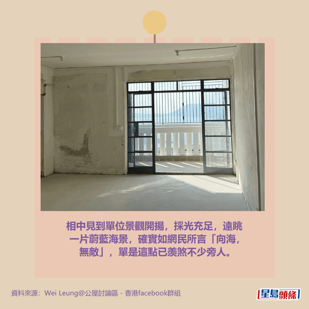 獲派華富二邨華泰樓的樓主,在回應網民提問時補充,新居屬4人單位,「網上話有39.85平方」。相中見到單位景觀開揚,採光充足,遠眺一片蔚藍海景,確實如網民所言「向海,無敵」,單是這點已羡煞不少旁人。