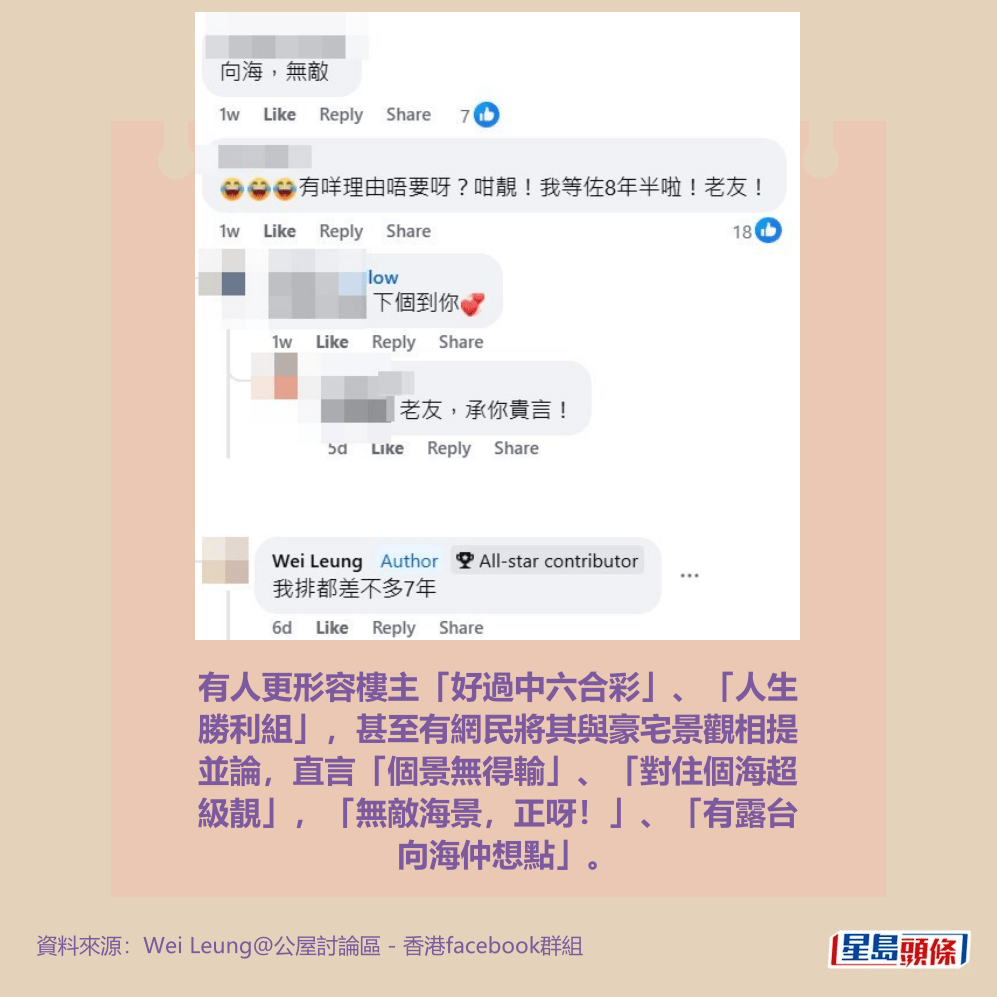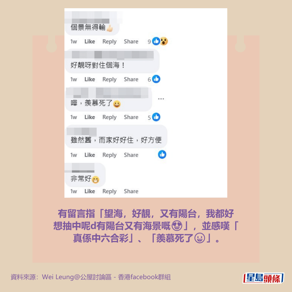 不少網民留言祝賀樓主——「恭喜🎉🎉🎉」、「安居樂業喇👏👏👏」。有人更形容樓主「好過中六合彩」、「人生勝利組」,甚至有網民將其與豪宅景觀相提並論,直言「個景無得輸」、「對住個海超級靚」,「無敵海景,正呀!」、「有露台向海仲想點」。有留言指「望海,好靚,又有陽台,我都好想抽中呢d有陽台又有海景嘅😍」,並感嘆「真係中六合彩」、「羨慕死了😀」。
