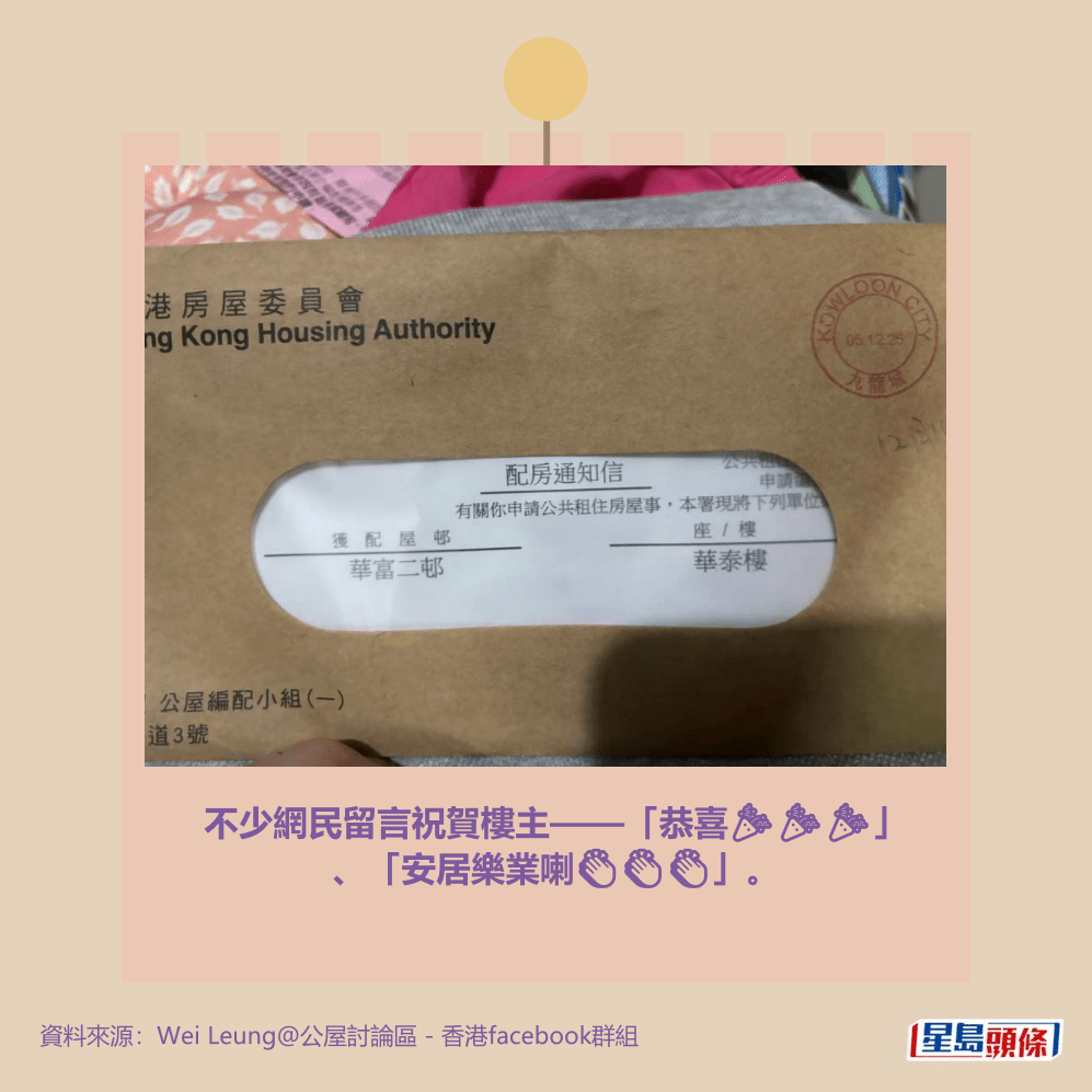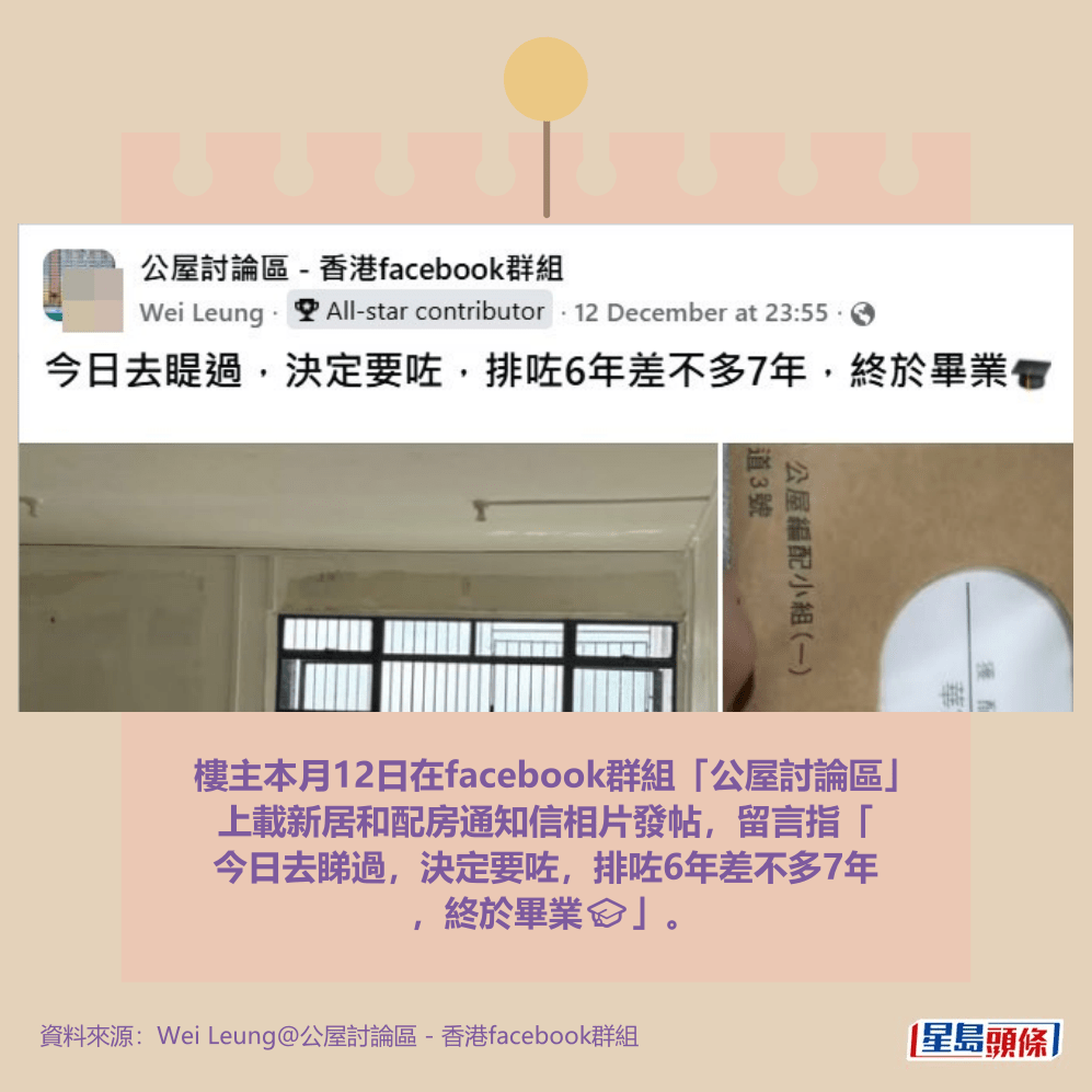 樓主本月12日在facebook群組「公屋討論區」上載新居和配房通知信相片發帖,留言指「今日去睇過,決定要咗,排咗6年差不多7年,終於畢業🎓」。