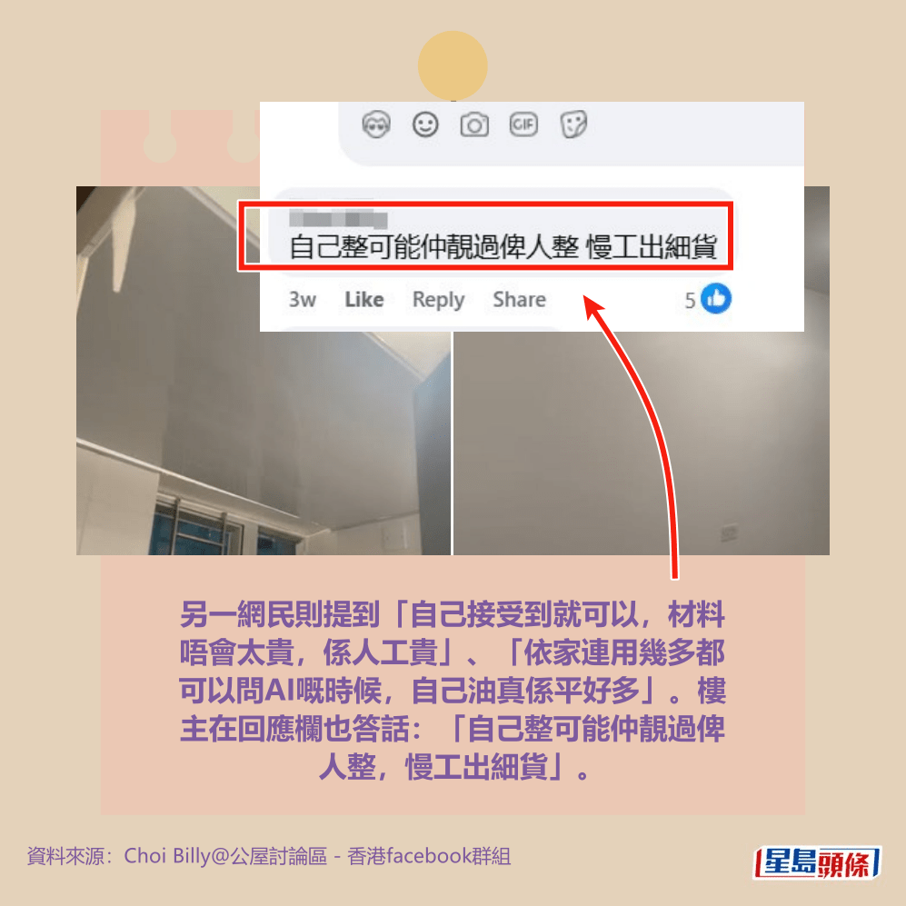 另一網民則提到「自己接受到就可以,材料唔會太貴,係人工貴」、「依家連用幾多都可以問AI嘅時候,自己油真係平好多」。樓主在回應欄也答話:「自己整可能仲靚過俾人整,慢工出細貨」。