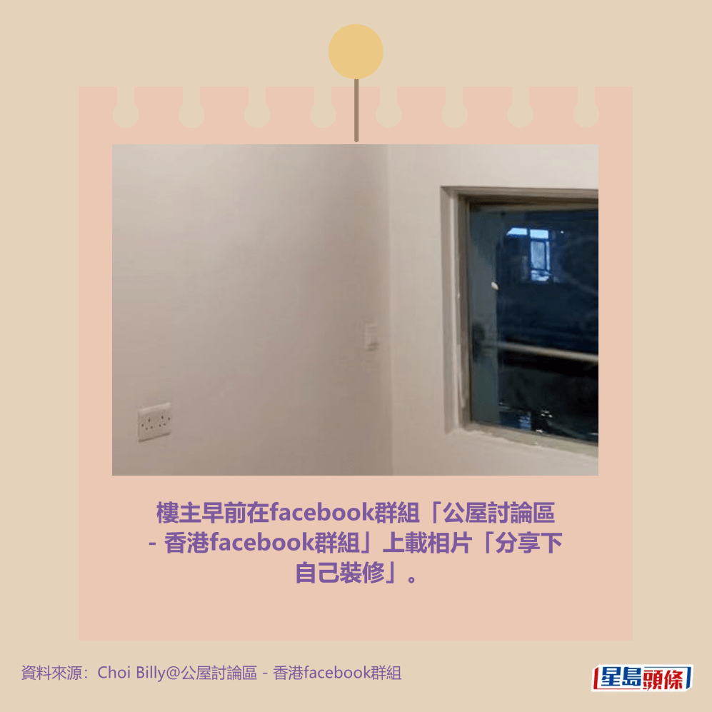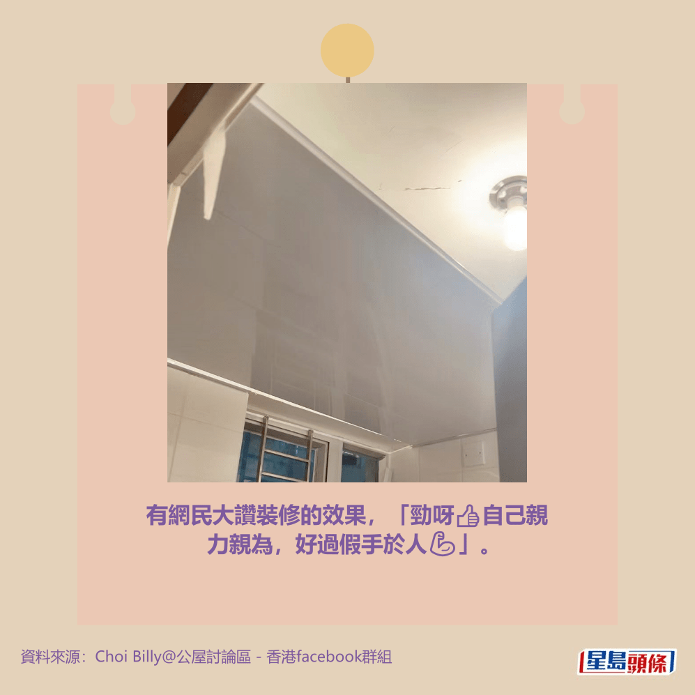 樓主早前在facebook群組「公屋討論區 – 香港facebook群組」上載相片「分享下自己裝修」。就牆身翻新,樓主提供了5步曲的步驟:「批灰 + 2次底漆 + 2次乳膠漆」;天花吊頂方面,樓主更加表示「自己買料,廚廁大約500元好易整」,並在回應欄貼出照片展示了「差開2個窿,裝筒燈攪掂」的成果。