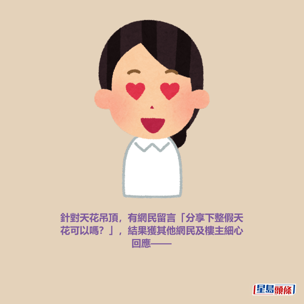 針對天花吊頂,有網民留言「分享下整假天花可以嗎?」,結果獲其他網民及樓主細心回應。有網民推薦「集成鋁扣板,廚房同洗手間必揀!我屋企全靠佢防油煙同水氣,壞咗單塊都可以換㗎」,樓主則提供了安裝方法「四邊鋁角鐵、玻璃膠固定、度尺網上買天花鋁板(尺寸要訂制)裝上去就可以」。