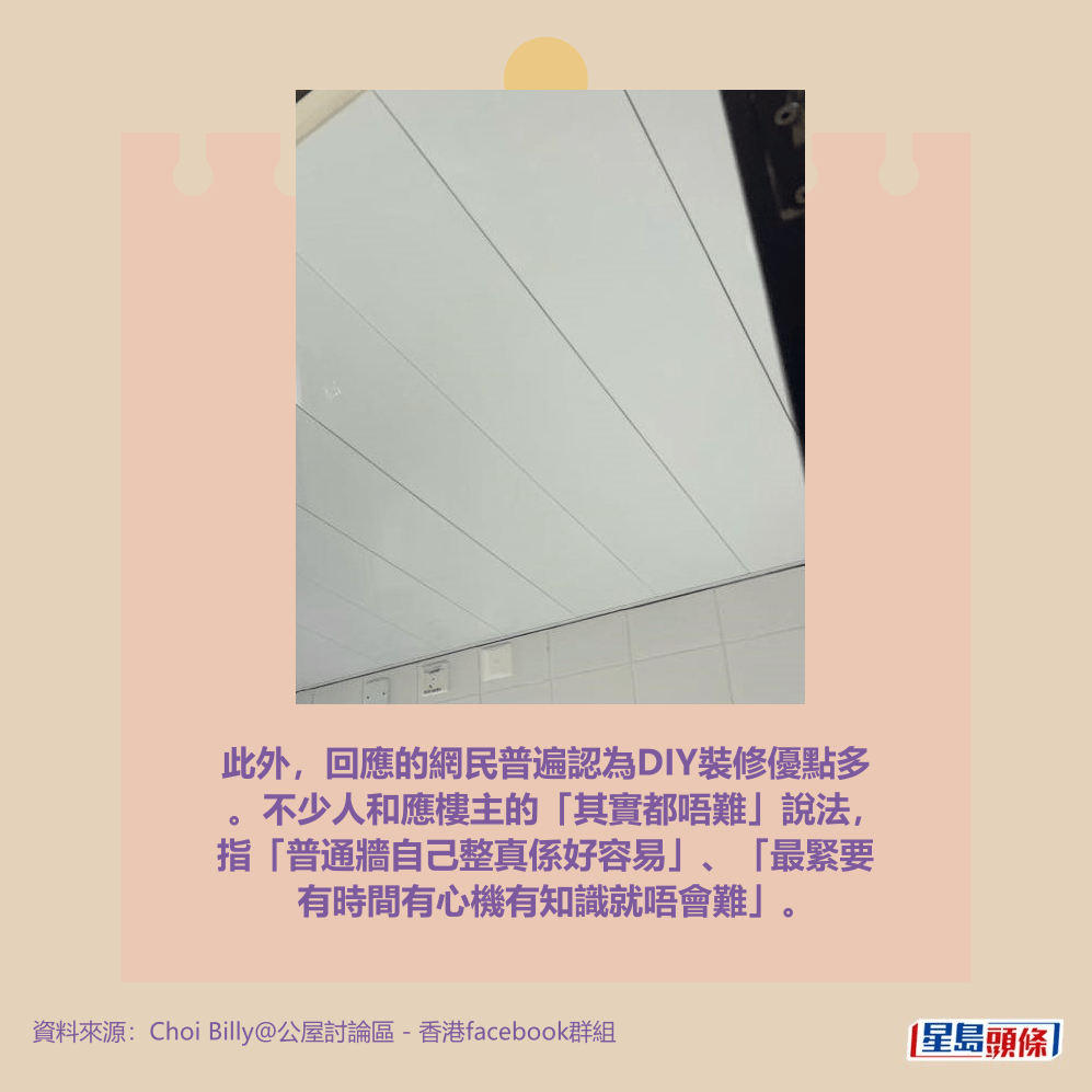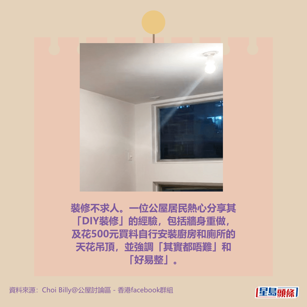 裝修不求人。一位公屋居民熱心分享其「DIY裝修」的經驗,包括牆身重做,及花500元買料自行安裝廚房和廁所的天花吊頂,並強調「其實都唔難」和「好易整」。詳情見下圖及下文:
