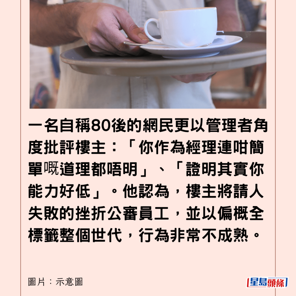 一名自稱80後的網民更以管理者角度批評樓主:「你作為經理連咁簡單嘅道理都唔明」、「證明其實你能力好低」。他認為,樓主將請人失敗的挫折公審員工,並以偏概全標籤整個世代,行為非常不成熟。
