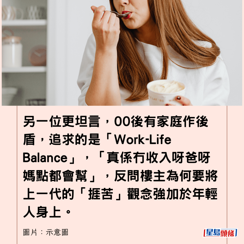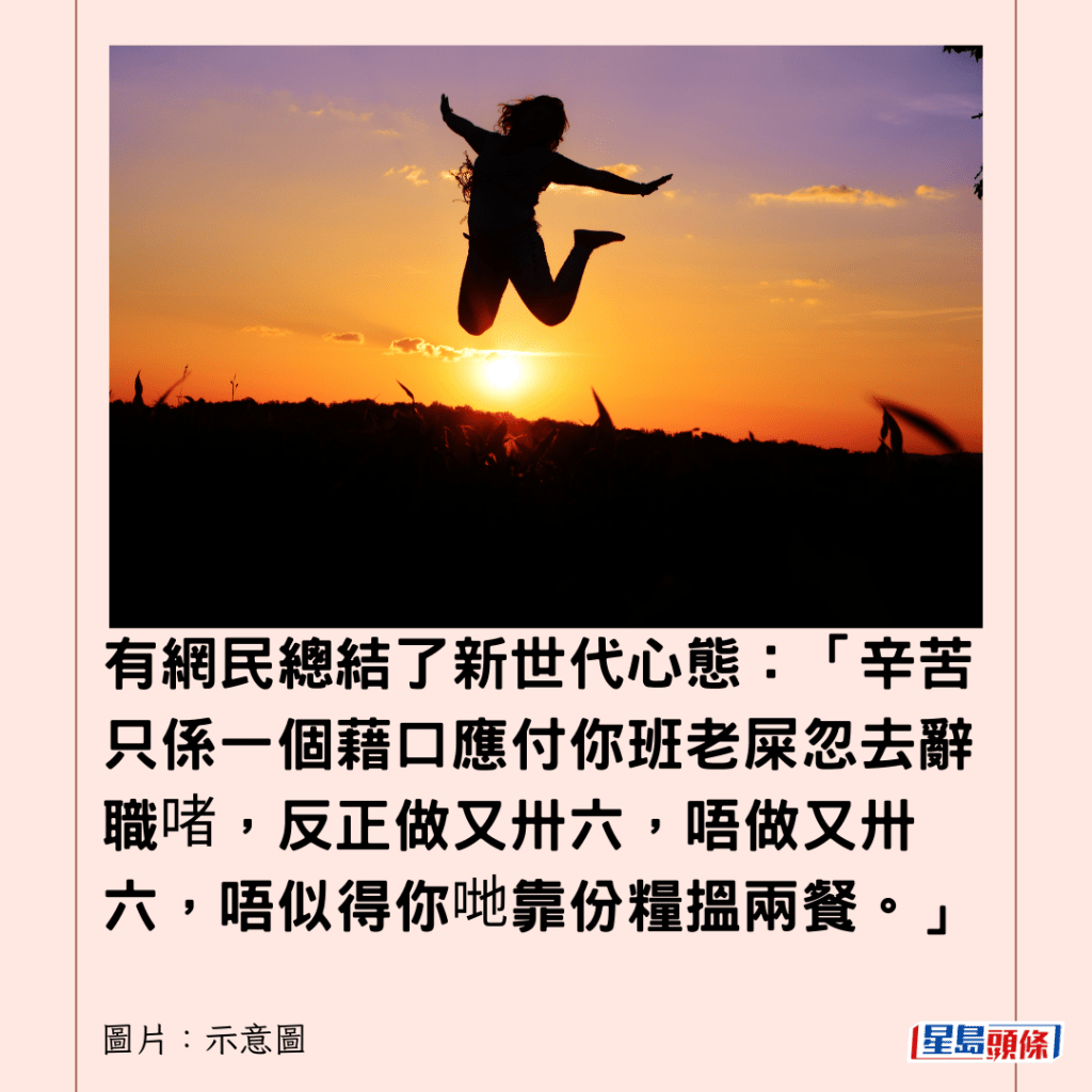 有網民總結了新世代心態:「辛苦只係一個藉口應付你班老屎忽去辭職啫,反正做又卅六,唔做又卅六,唔似得你哋靠份糧搵兩餐。」另一位更坦言,00後有家庭作後盾,追求的是「Work-Life Balance」,「真係冇收入呀爸呀媽點都會幫」,反問樓主為何要將上一代的「捱苦」觀念強加於年輕人身上。