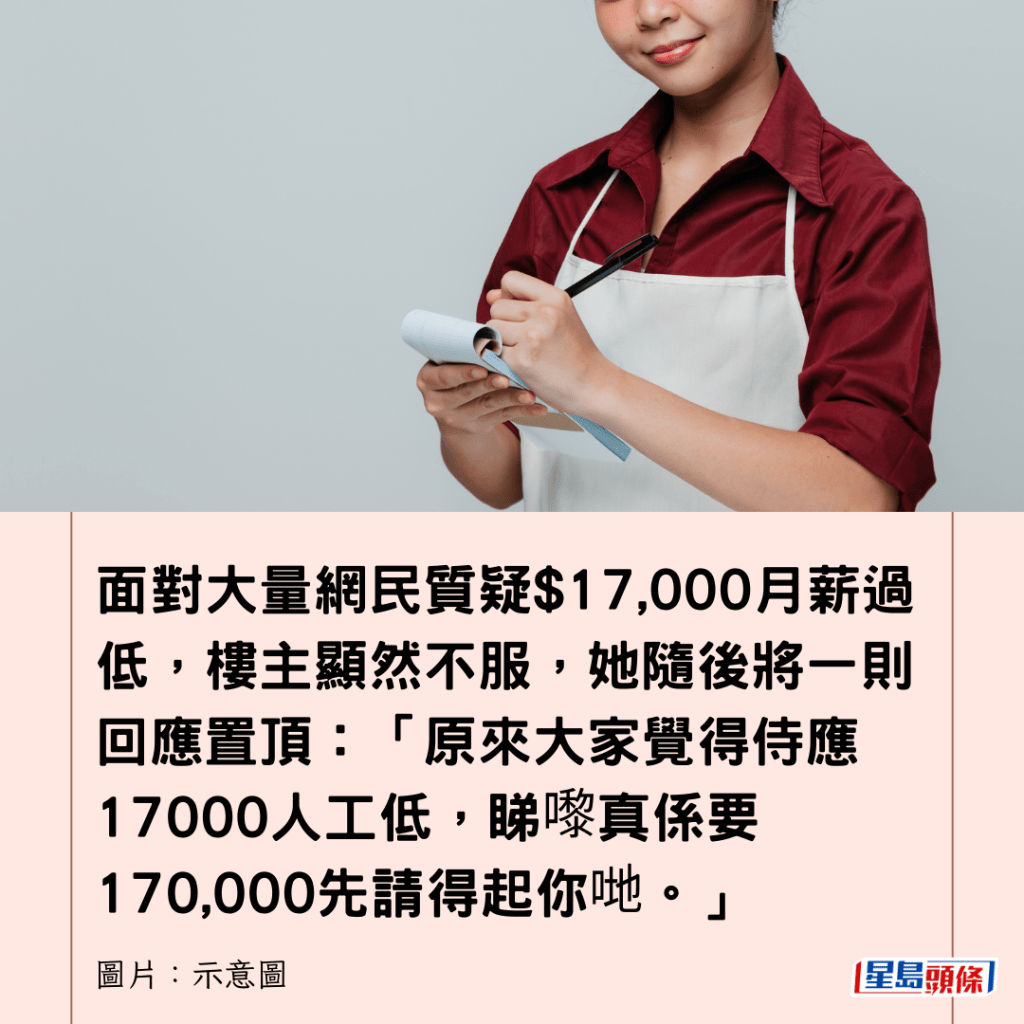 面對大量網民質疑$17,000月薪過低,樓主顯然不服,她隨後將一則回應置頂:「原來大家覺得侍應17000人工低,睇嚟真係要170,000先請得起你哋。」