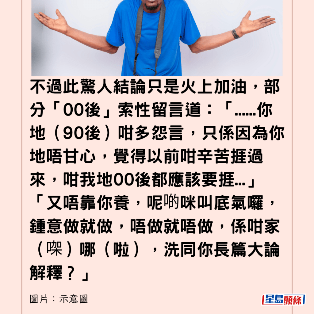 不過此驚人結論只是火上加油,部分「00後」索性留言道:「……你地(90後)咁多怨言,只係因為你地唔甘心,覺得以前咁辛苦捱過來,咁我地00後都應該要捱…」 「又唔靠你養,呢啲咪叫底氣囉,鍾意做就做,唔做就唔做,係咁家(㗎)哪(啦),洗同你長篇大論解釋?」