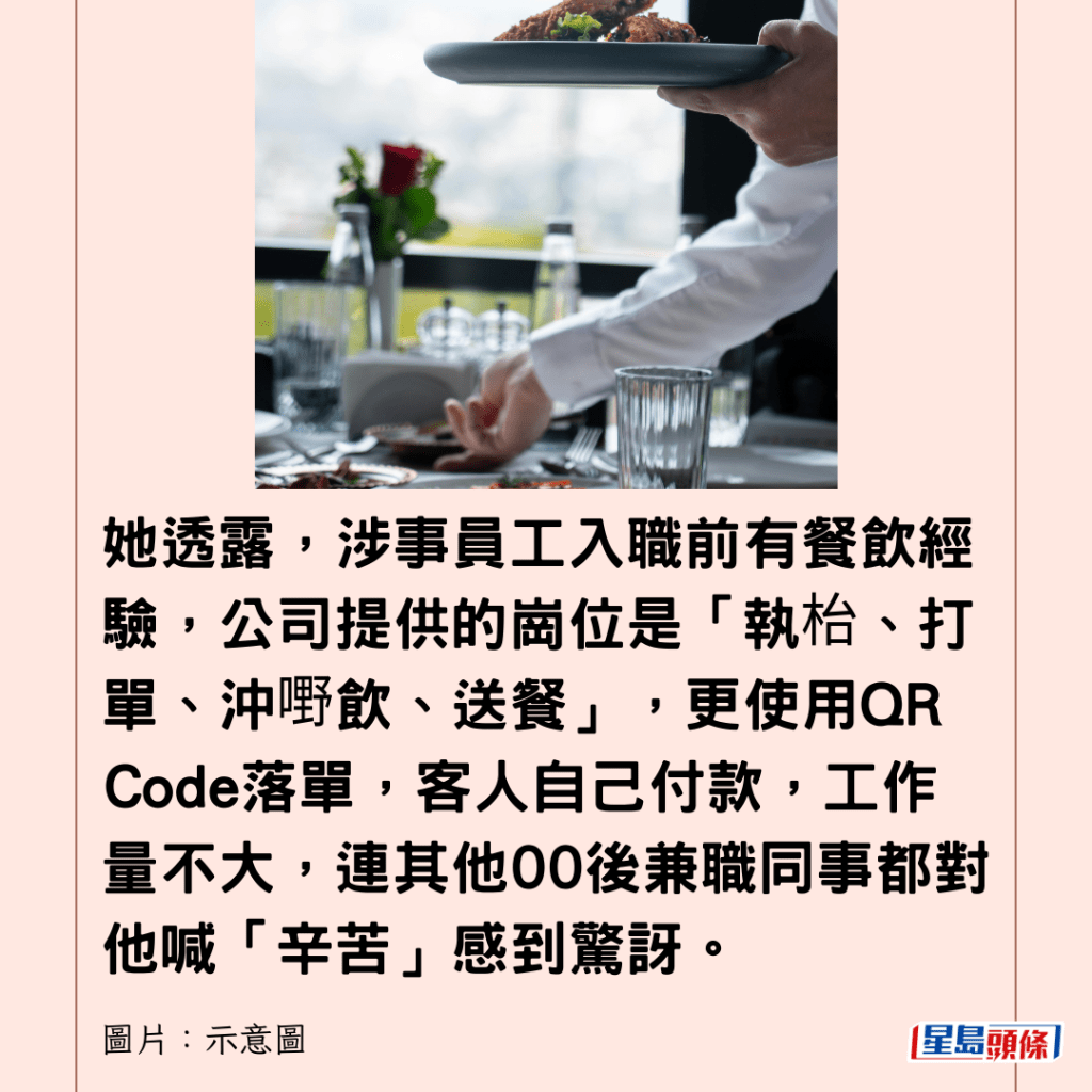 她透露,涉事員工入職前有餐飲經驗,公司提供的崗位是「執枱、打單、沖嘢飲、送餐」,更使用QR Code落單,客人自己付款,工作量不大,連其他00後兼職同事都對他喊「辛苦」感到驚訝。