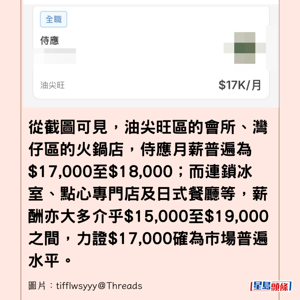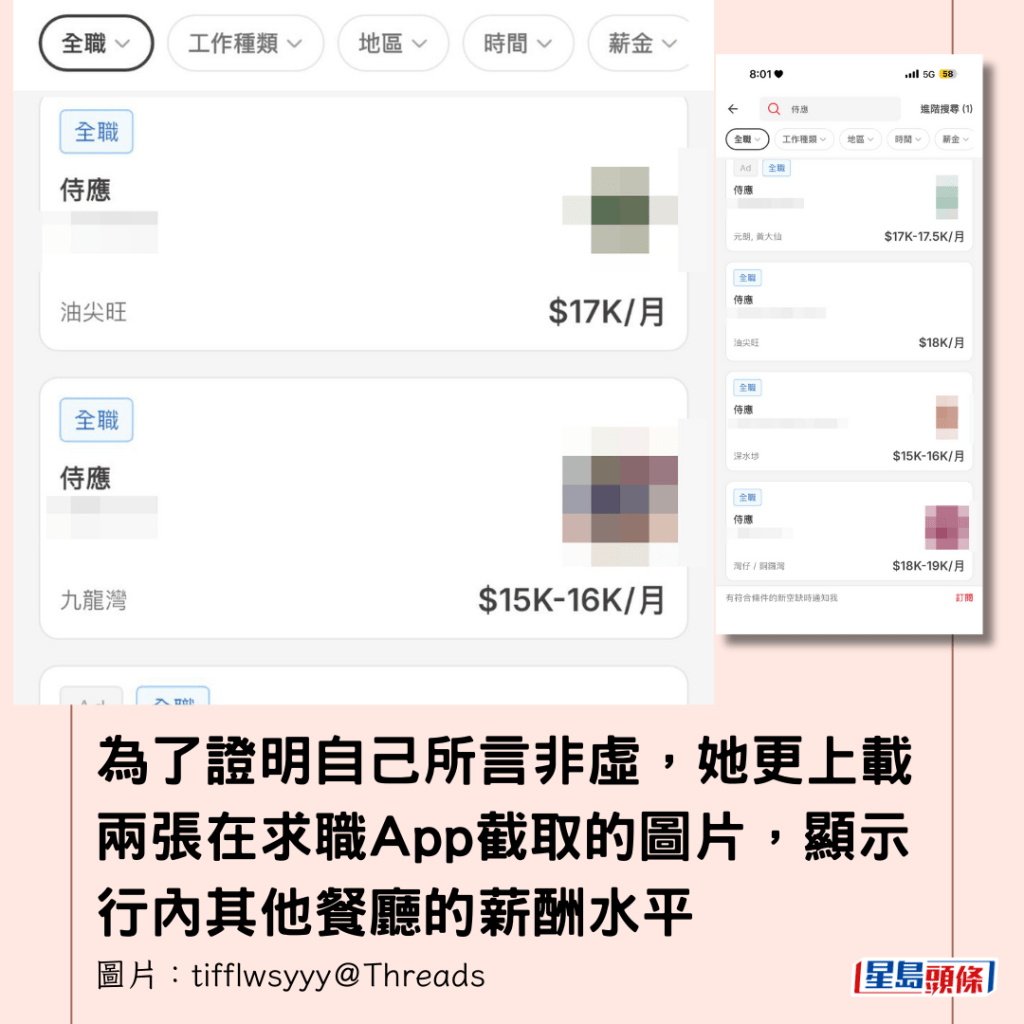 為了證明自己所言非虛,她更上載兩張在求職App截取的圖片,顯示行內其他餐廳的薪酬水平,從截圖可見,油尖旺區的會所、灣仔區的火鍋店,侍應月薪普遍為$17,000至$18,000;而連鎖冰室、點心專門店及日式餐廳等,薪酬亦大多介乎$15,000至$19,000之間,力證$17,000確為市場普遍水平。