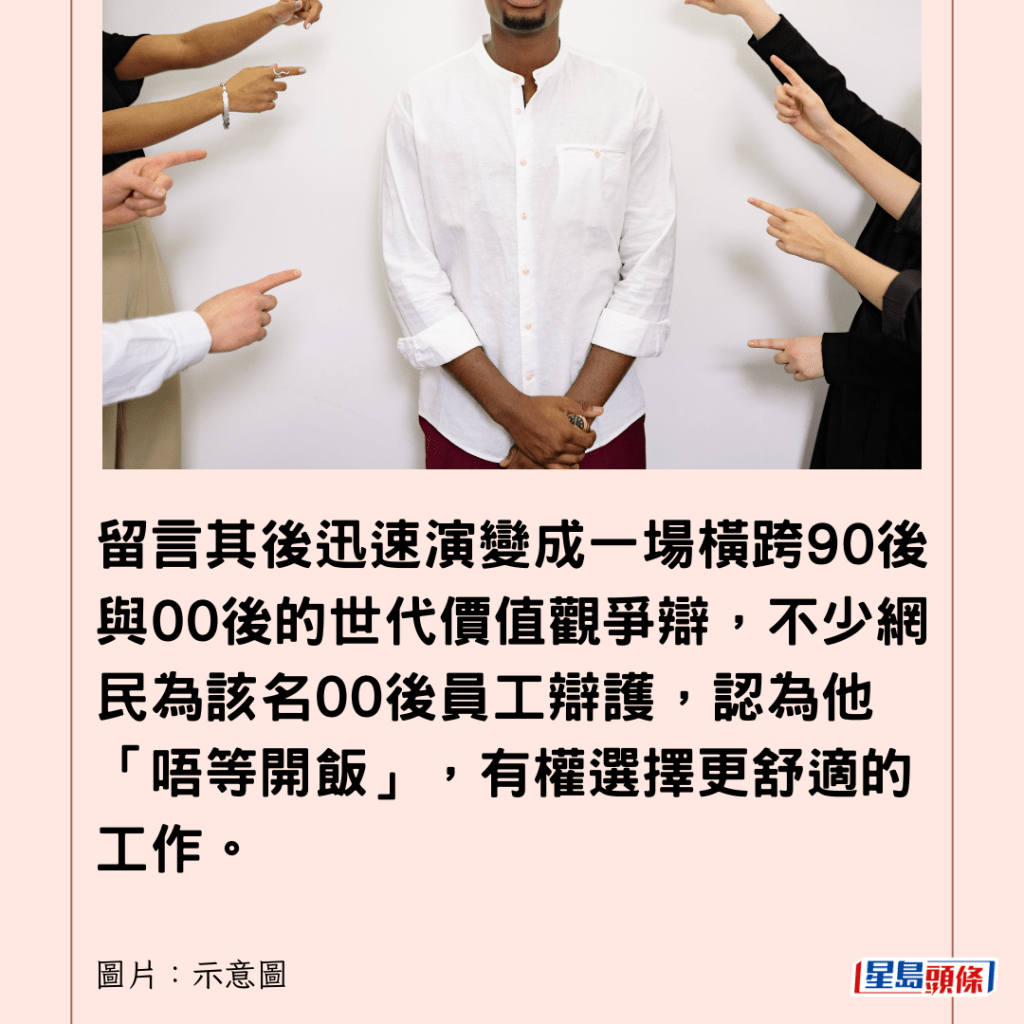 留言其後迅速演變成一場橫跨90後與00後的世代價值觀爭辯,不少網民為該名00後員工辯護,認為他「唔等開飯」,有權選擇更舒適的工作。