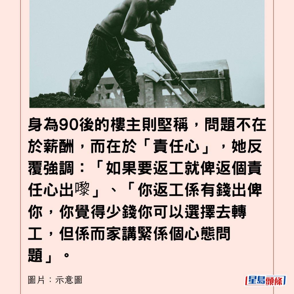 身為90後的樓主則堅稱,問題不在於薪酬,而在於「責任心」,她反覆強調:「如果要返工就俾返個責任心出嚟」、「你返工係有錢出俾你,你覺得少錢你可以選擇去轉工,但係而家講緊係個心態問題」。