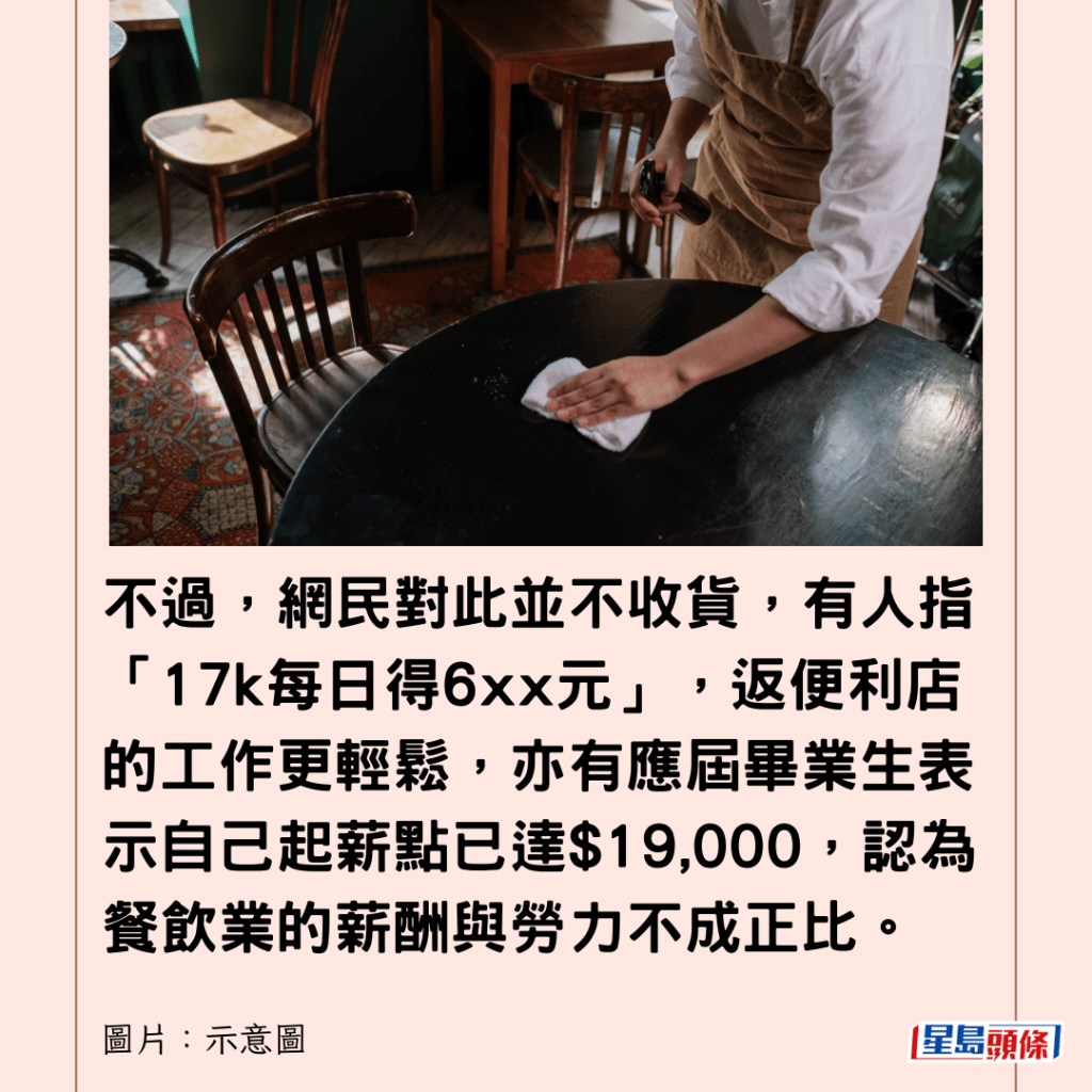 不過,網民對此並不收貨,有人指「17k每日得6xx元」,返便利店的工作更輕鬆,亦有應屆畢業生表示自己起薪點已達$19,000,認為餐飲業的薪酬與勞力不成正比。