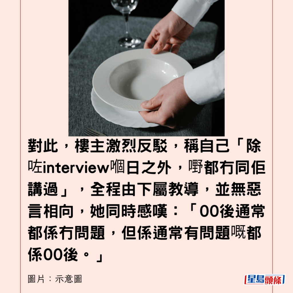 對此,樓主激烈反駁,稱自己「除咗interview嗰日之外,嘢都冇同佢講過」,全程由下屬教導,並無惡言相向,她同時感嘆:「00後通常都係冇問題,但係通常有問題嘅都係00後。」