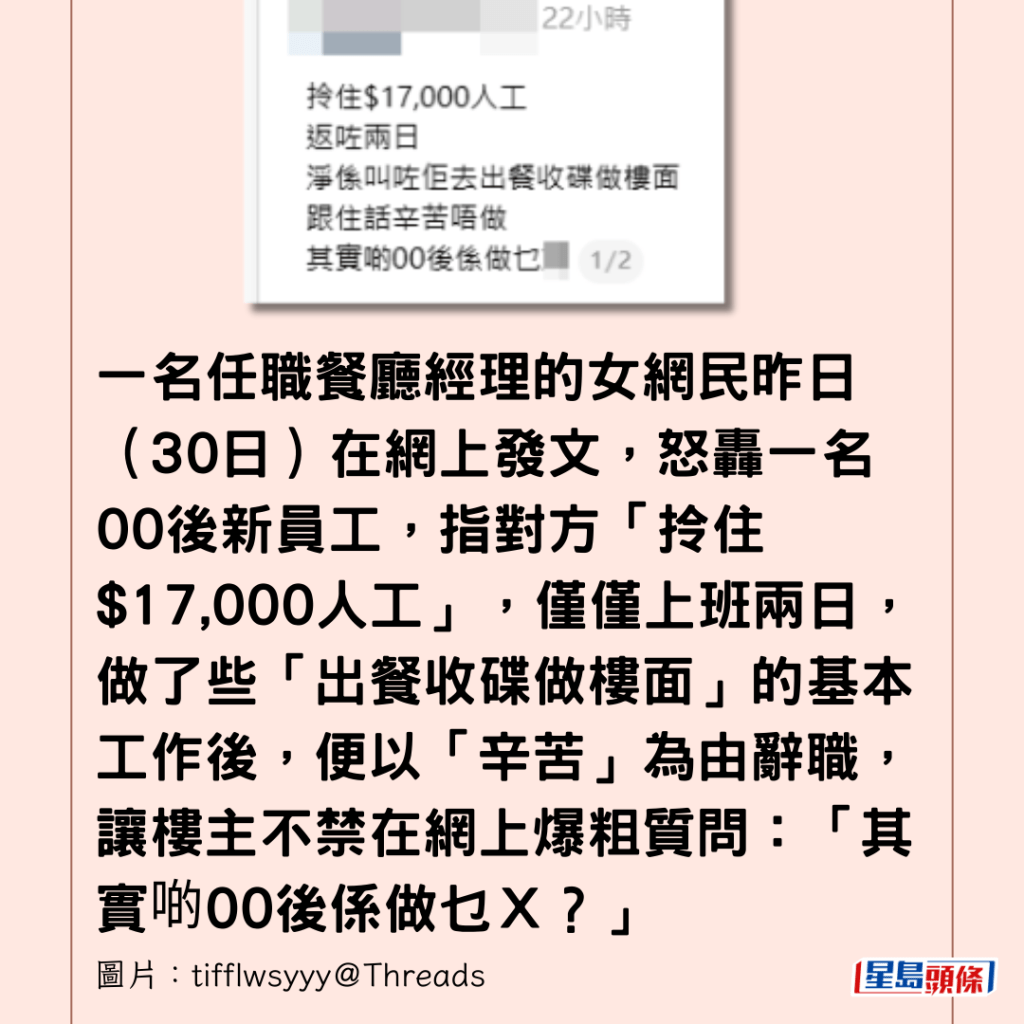 一名任職餐廳經理的女網民昨日(30日)在網上發文,怒轟一名00後新員工,指對方「拎住$17,000人工」,僅僅上班兩日,做了些「出餐收碟做樓面」的基本工作後,便以「辛苦」為由辭職,讓樓主不禁在網上爆粗質問:「其實啲00後係做乜X?」