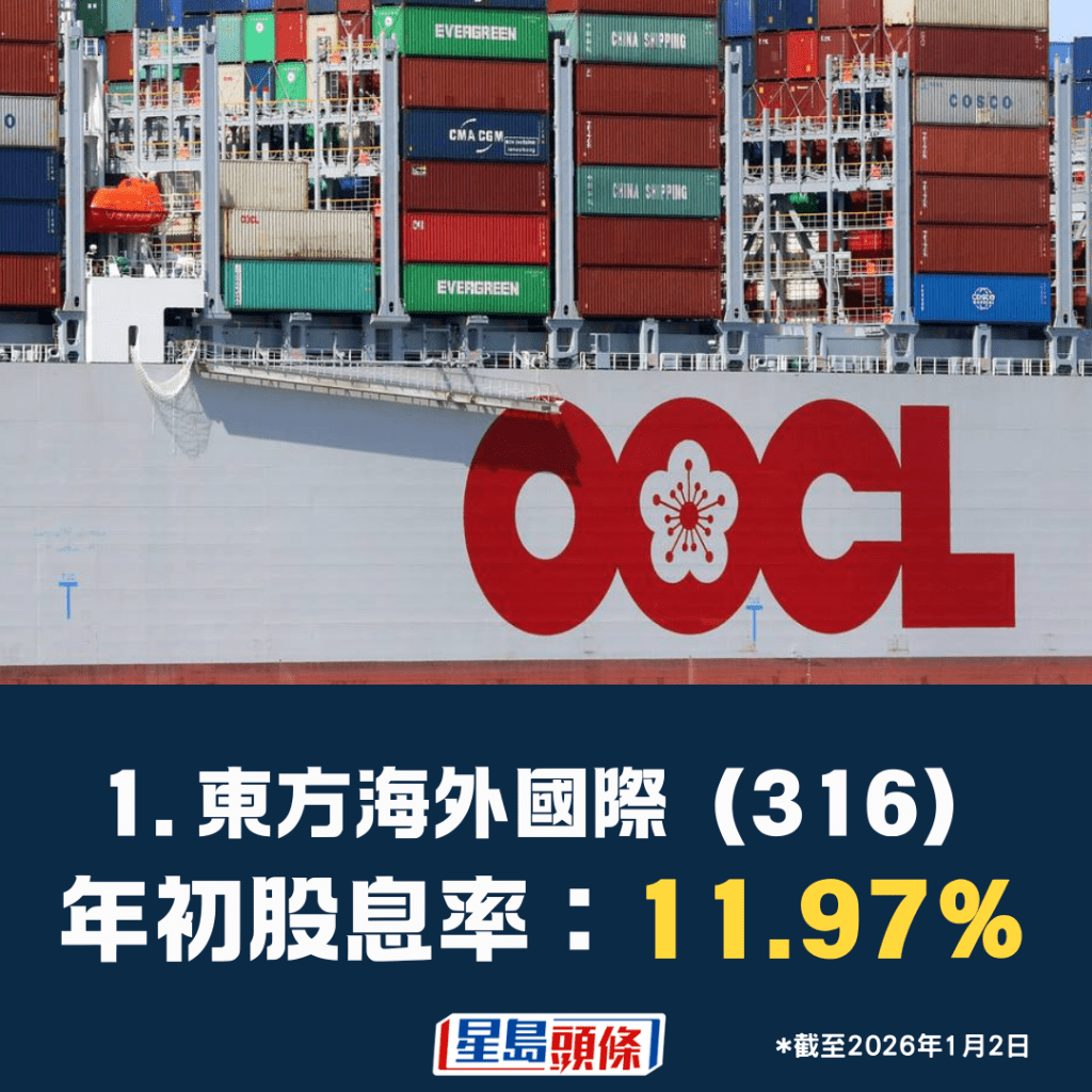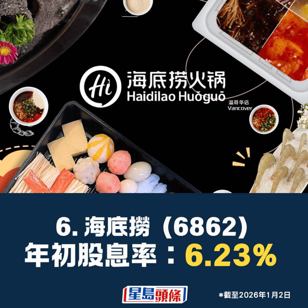 2026年狗股名單繼續以最高股息率選股,以過去12個月派息計算,最終得出的10隻股份為:東方海外國際(316)、領展(823)、中石化(386)、華潤電力(836)、中海油(883)、恒基地產(12)、中國神華(1088)、海底撈(6862)、中國移動(941)及中石油(857)。這份名單主要涉及五大投資主題,包括「中特估」、能源、消費餐飲、地產及航運板塊。