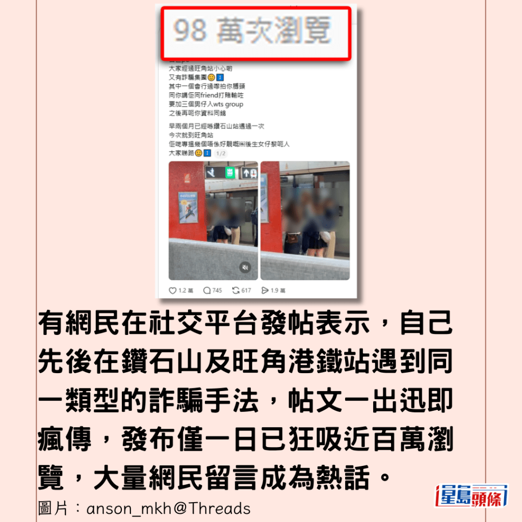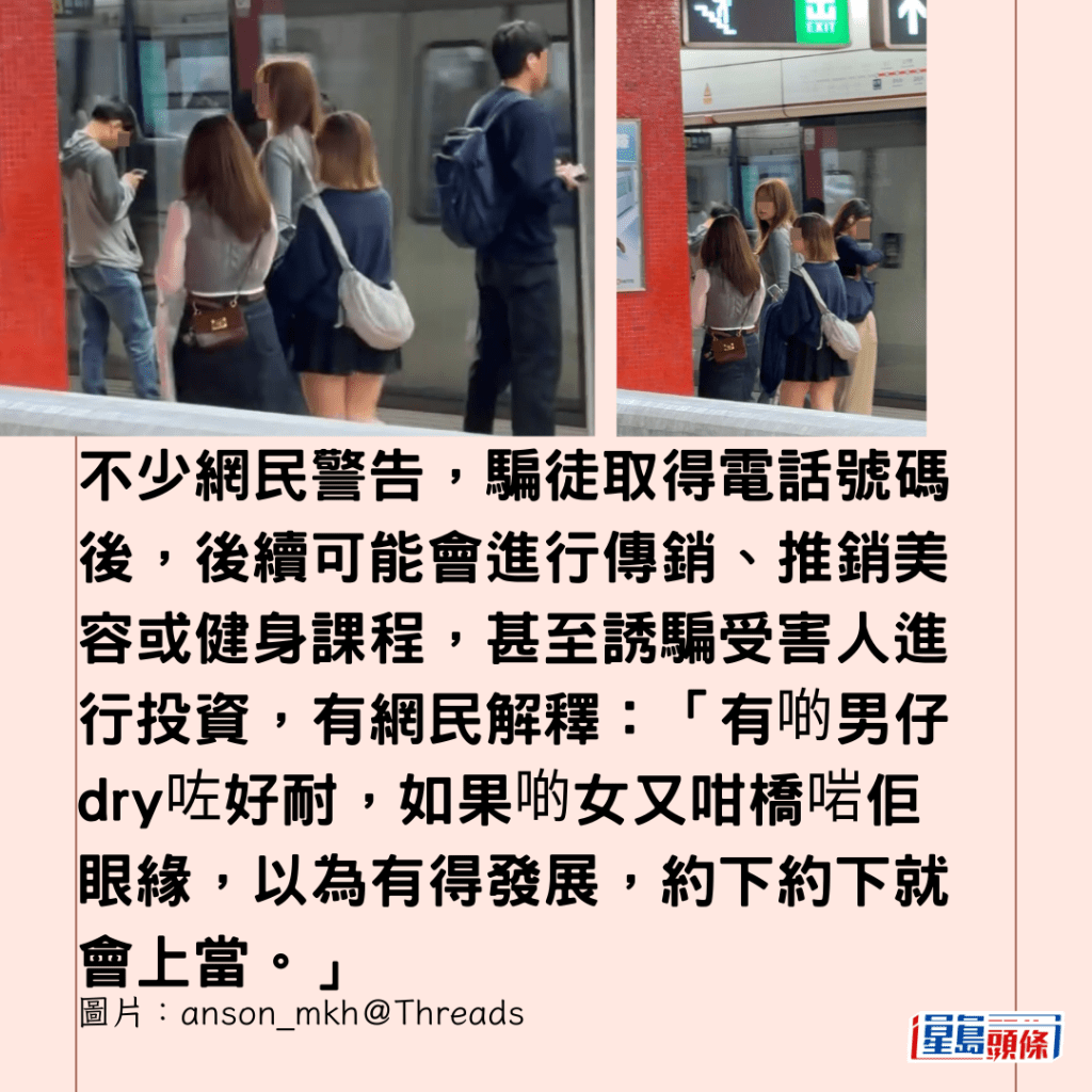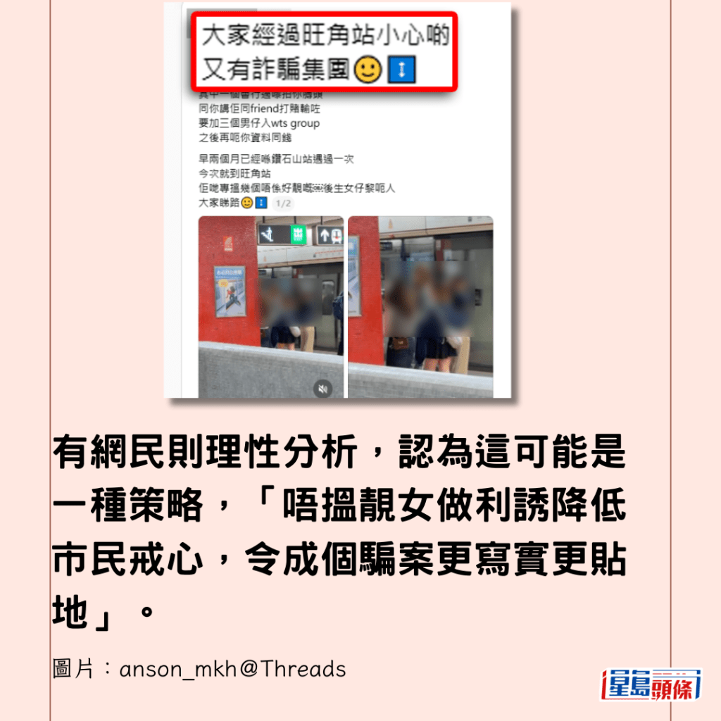 有網民昨日(3日)在網上發「警世po」,他在旺角遇到3名少女組成的疑似詐騙集團,樓主警告,有詐騙集團在旺角、鑽石山等港鐵站出沒,手法新穎,專門針對男性,而網民的討論焦點,卻意外地落在騙徒的外貌,與及樓主的「核彈級」點評。