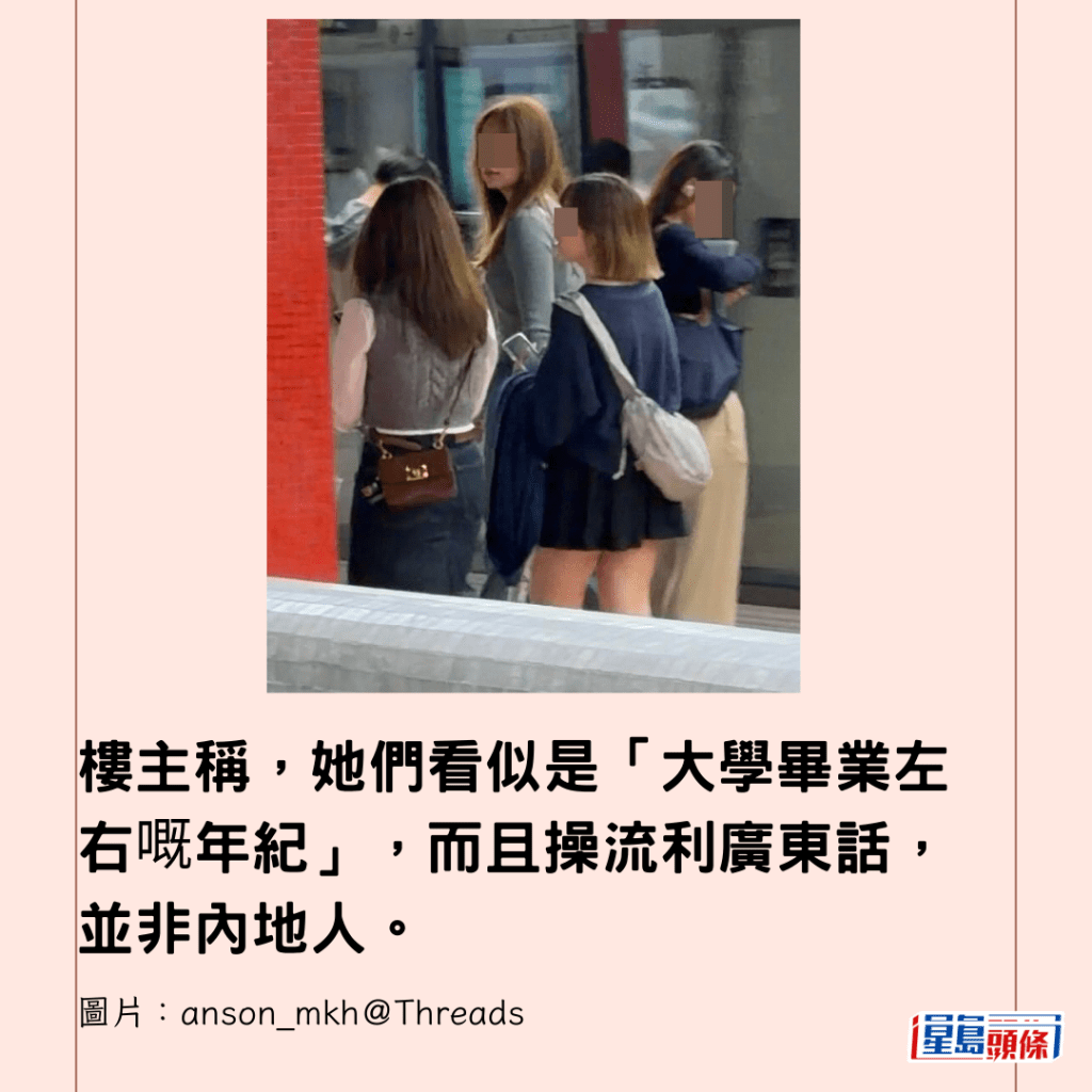 樓主稱,她們看似是「大學畢業左右嘅年紀」,而且操流利廣東話,並非內地人。