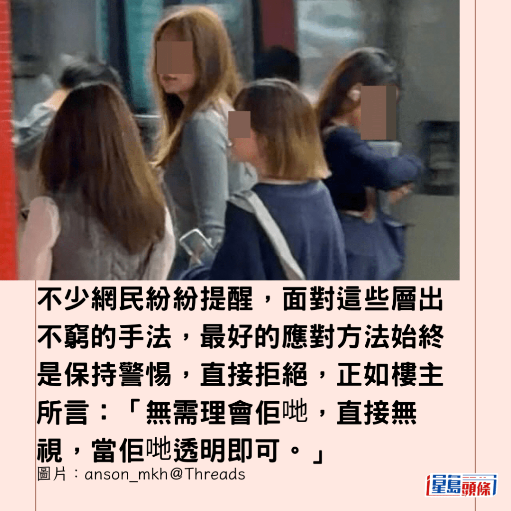 事件在網上曝光後,有網民提醒,「而家喺threads度揚咗,佢哋之後可能會轉玩法,改梗小小嘢,會出現變體,大家小心」,不少網民紛紛提醒,面對這些層出不窮的手法,最好的應對方法始終是保持警惕,直接拒絕,正如樓主所言:「無需理會佢哋,直接無視,當佢哋透明即可。」