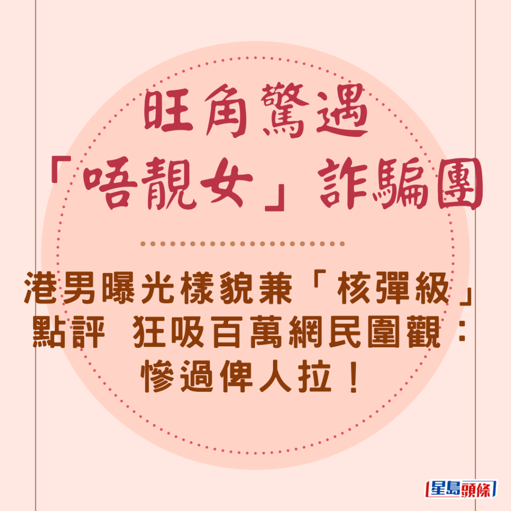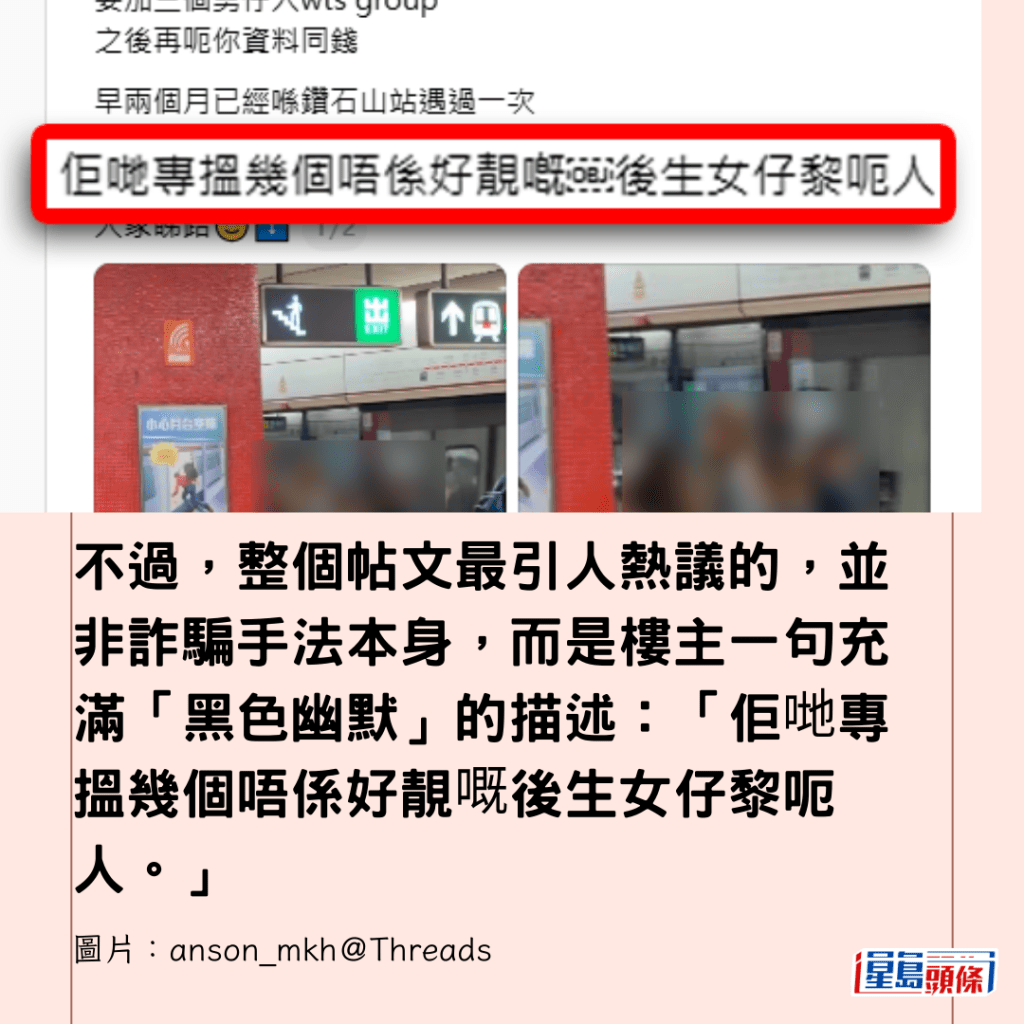 不過,整個帖文最引人熱議的,並非詐騙手法本身,而是樓主一句充滿「黑色幽默」的描述:「佢哋專搵幾個唔係好靚嘅後生女仔黎呃人。」