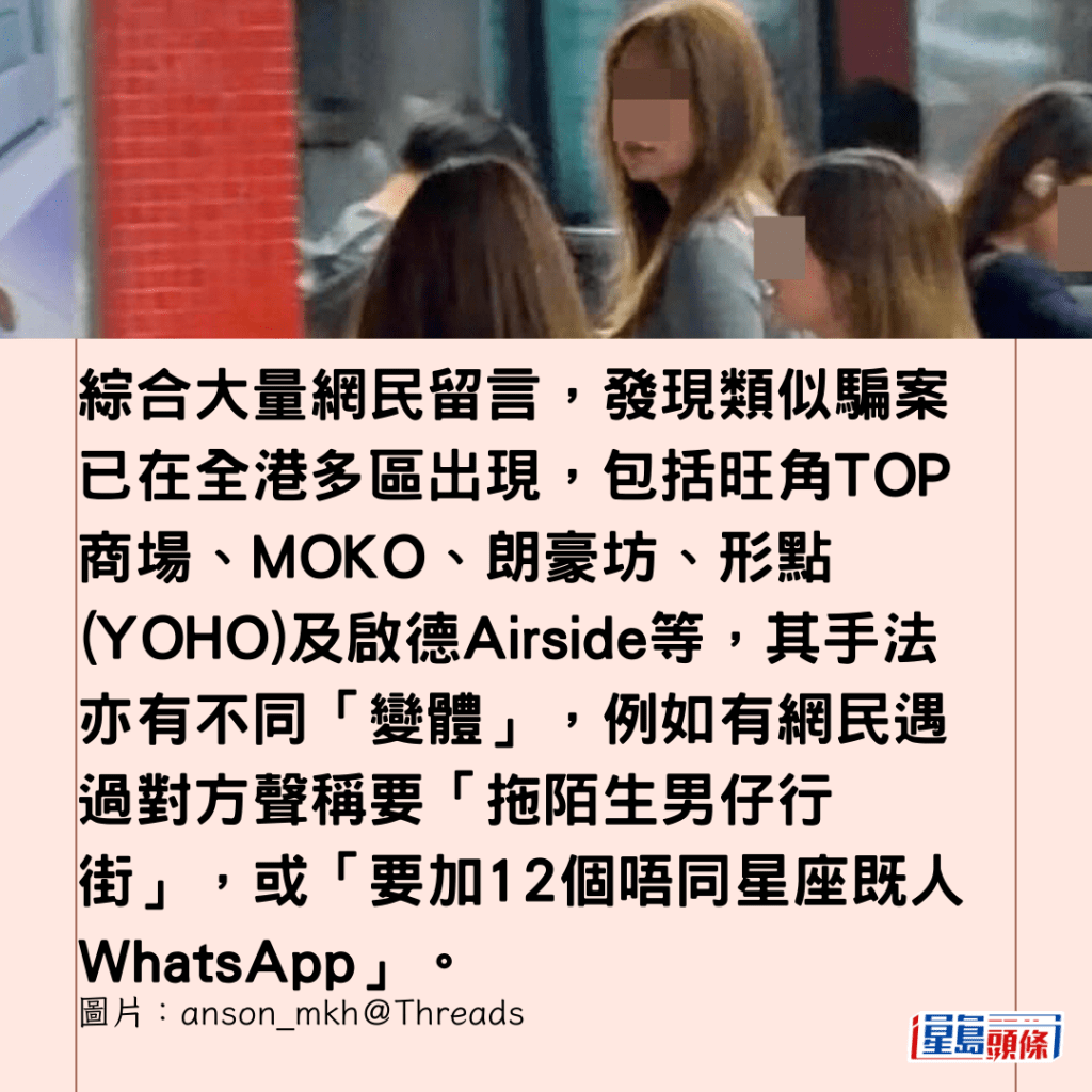 綜合大量網民留言,發現類似騙案已在全港多區出現,包括旺角TOP商場、MOKO、朗豪坊、形點(YOHO)及啟德Airside等,其手法亦有不同「變體」,例如有網民遇過對方聲稱要「拖陌生男仔行街」,或「要加12個唔同星座既人WhatsApp」。