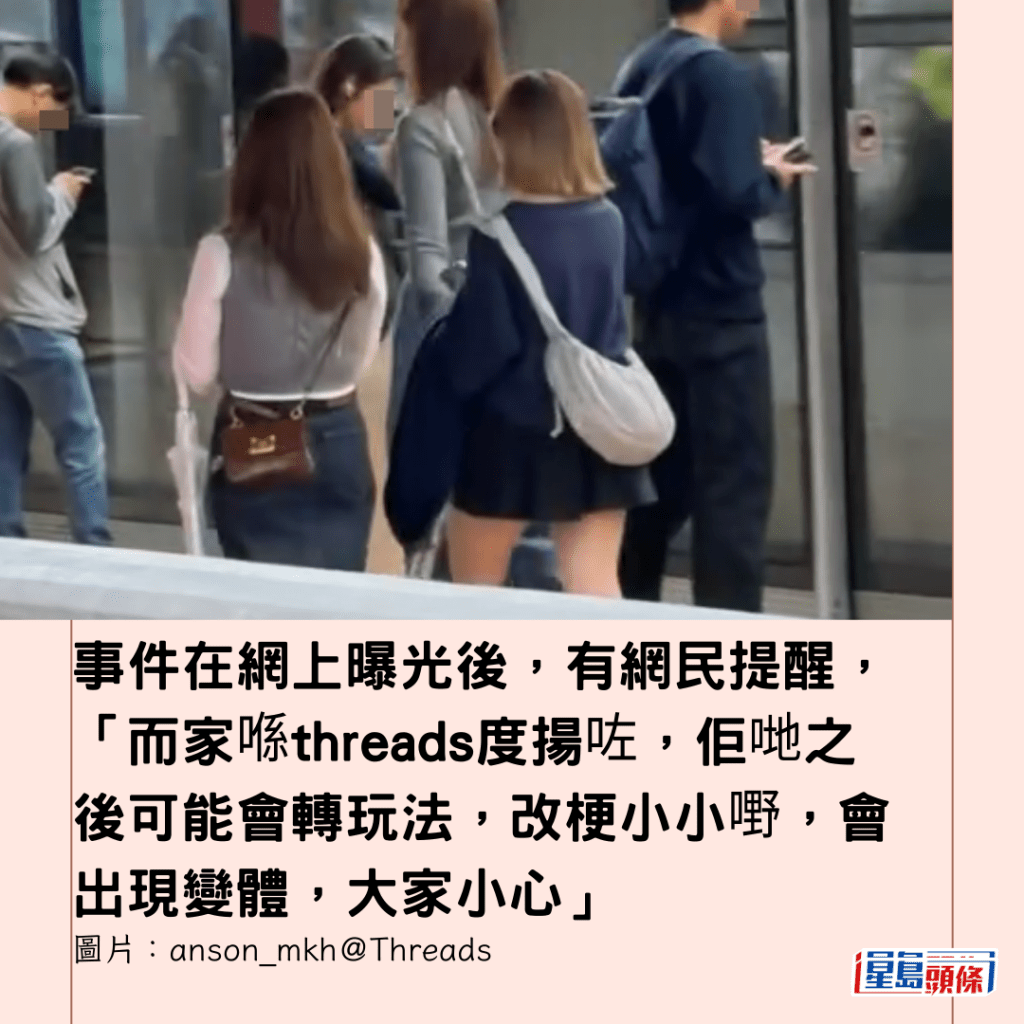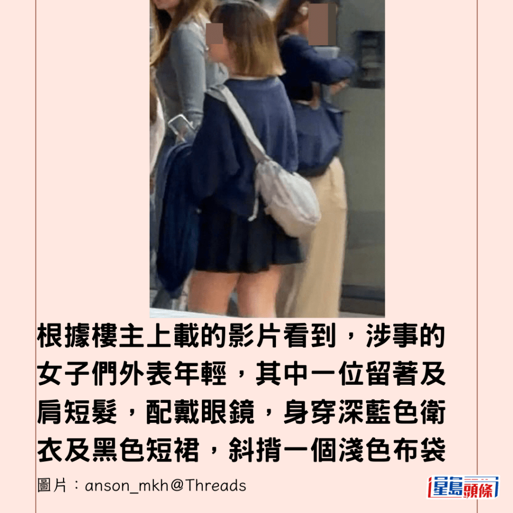 根據樓主上載的影片看到,涉事的女子們外表年輕,其中一位留著及肩短髮,配戴眼鏡,身穿深藍色衛衣及黑色短裙,斜揹一個淺色布袋;另一位則有著一頭淺啡色長髮,身穿灰色緊身長袖上衣;還有一位背對鏡頭的女子,則穿著白色上衣外搭一件灰色背心、深色裙及一個啡色金屬扣的小方包。