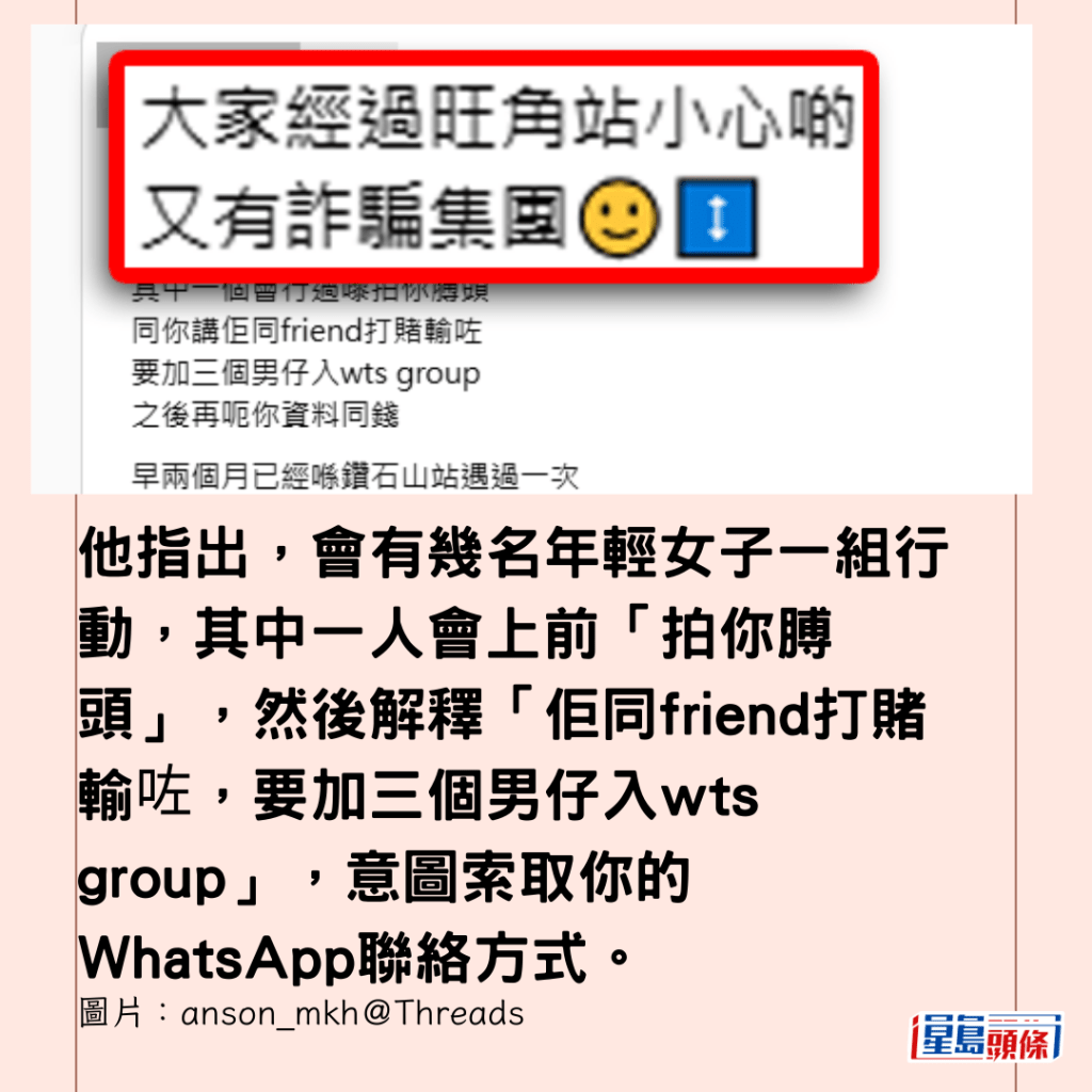 有網民昨日(3日)在社交平台發帖表示,自己先後在鑽石山及旺角港鐵站遇到同一類型的詐騙手法,他指出,會有幾名年輕女子一組行動,其中一人會上前「拍你膊頭」,然後解釋「佢同friend打賭輸咗,要加三個男仔入wts group」,意圖索取你的WhatsApp聯絡方式。