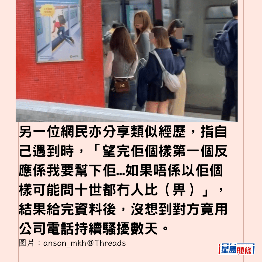 另一位網民亦分享類似經歷,指自己遇到時,「望完佢個樣第一個反應係我要幫下佢…如果唔係以佢個樣可能問十世都冇人比(畀)」,結果給完資料後,沒想到對方竟用公司電話持續騷擾數天。