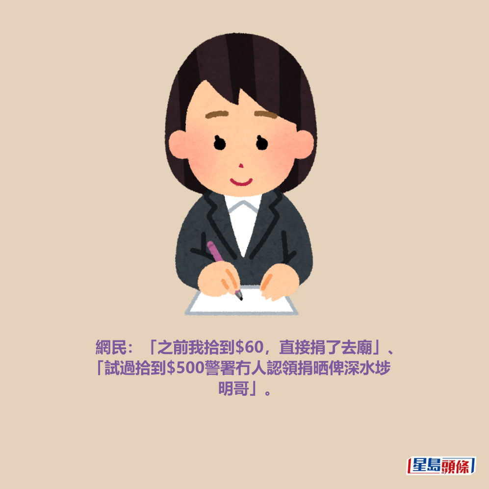 有網民分享了類似經驗:「咁大個仔執過兩次500蚊,第一次中三嗰年小息喺操場,交咗去校務處,記咗個優點,第二次30幾年前喺灣仔街上面都執到500蚊,交去警署,3個月後變成咗我嘅橫財」、「之前我拾到$60,直接捐了去廟」、「試過拾到$500警署冇人認領捐晒俾深水埗明哥」。