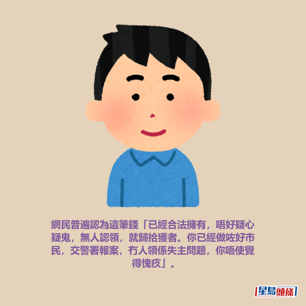 網民普遍認為這筆錢「已經合法擁有,唔好疑心疑鬼,無人認領,就歸拾獲者。你已經做咗好市民,交警署報案,冇人領係失主問題,你唔使覺得愧疚」。
