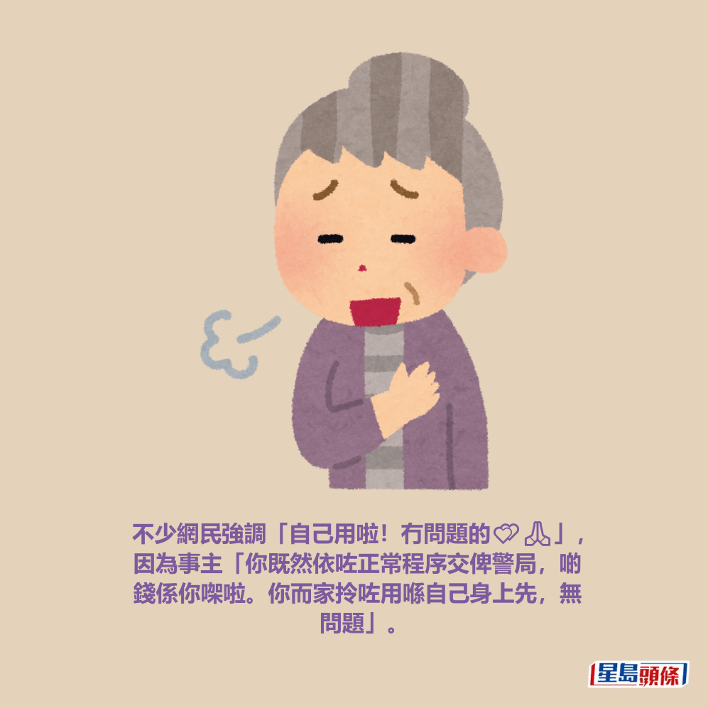 不少網民強調「自己用啦!冇問題的💕🙏」,因為事主「你既然依咗正常程序交俾警局,啲錢係你㗎啦。你而家拎咗用喺自己身上先,無問題」。