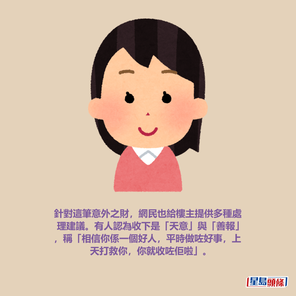 針對這筆意外之財,網民也給樓主提供多種處理建議。有人認為收下是「天意」與「善報」,稱「相信你係一個好人,平時做咗好事,上天打救你,你就收咗佢啦」。