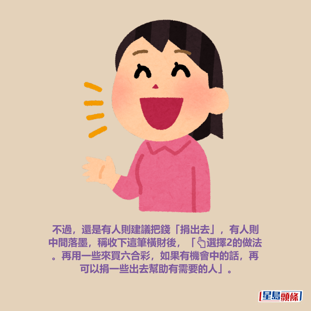 不過,還是有人則建議把錢「捐出去」,有人則中間落墨,稱收下這筆橫財後,「👆🏻選擇2的做法。再用一些來買六合彩,如果有機會中的話,再可以捐一些出去幫助有需要的人」、「拿去買六合彩,如果中便拿去做善事喇!也是替自己積德」、「你都做咗應做嘅事,咪捐10%出去囉」。