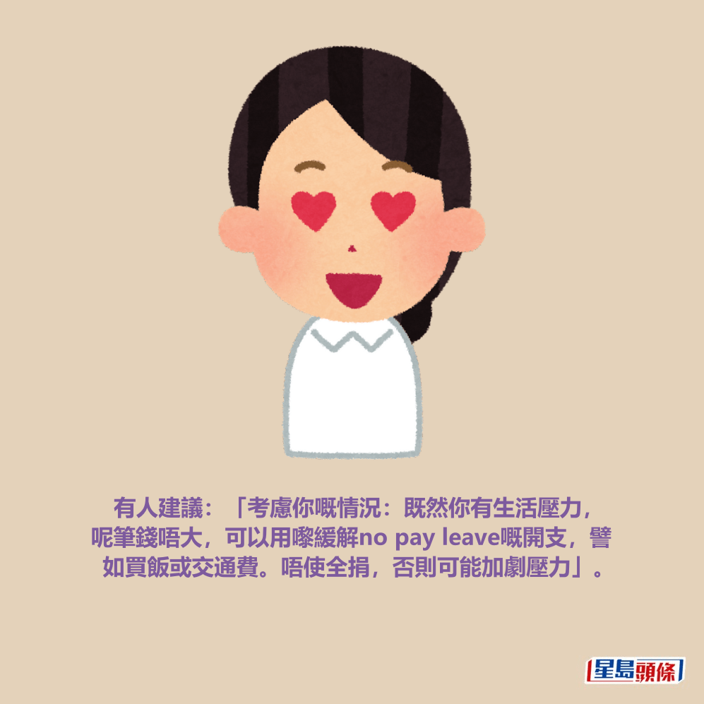 有人建議:「考慮你嘅情況:既然你有生活壓力,呢筆錢唔大,可以用嚟緩解no pay leave嘅開支,譬如買飯或交通費。唔使全捐,否則可能加劇壓力」。